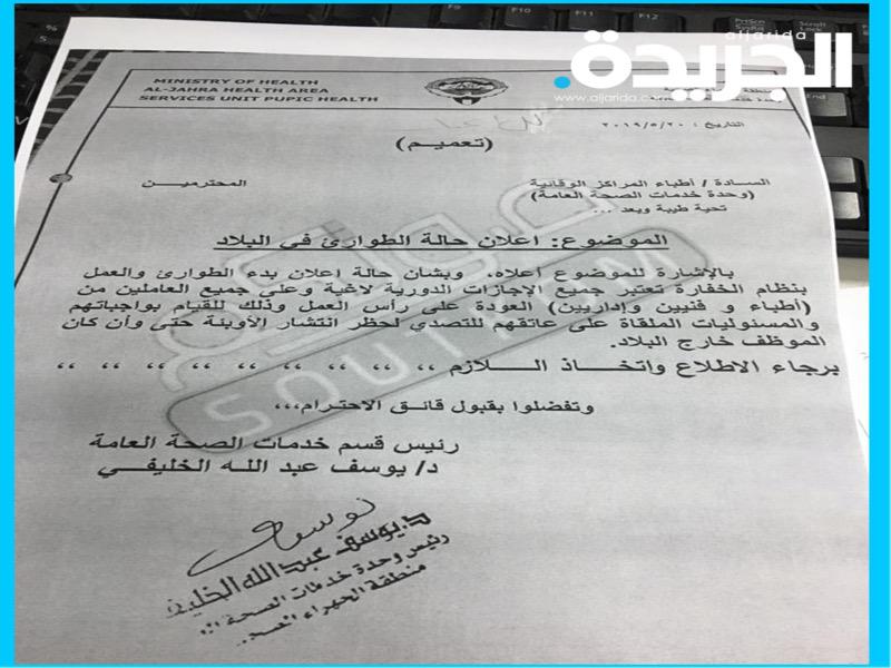 أحالت وزارة الصحة مسئول خدمات الصحة العامة في منطقة الجهراء الصحية للتحقيق لاصداره تعميم دون الرجوع إلى الجهات المعنية في الوزارة.وأكدت «الصحة» في بيان رسمي على أن الاجراءات الاحترازية التي تقوم بها «روتينية»، مبينة بأن خطة طوارئ الوزارة معدة من قبل ويتم تحديثها بشكل دوري بالإضافة إلى التنسيق مع كافة الجهات المعنية في الدولة.