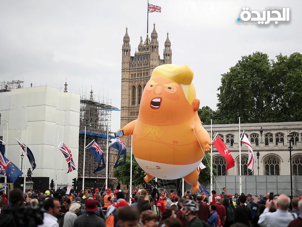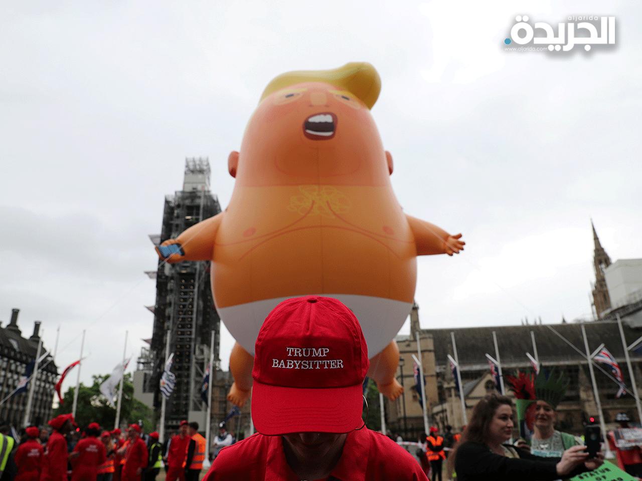 حلق بالون عملاق يصور الرئيس دونالد ترامب في شكل رضيع غاضب يرتدي حفاضا في السماء خارج البرلمان البريطاني في لندن اليوم قبل احتجاجات من المتوقع أن تكون ضمن أكبر التظاهرات الاحتجاجية في المدينة ضد زعيم أجنبي.