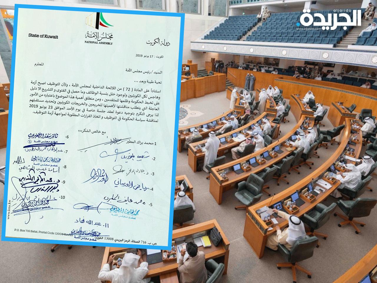 تقدم 11 نائباً بطلب عقد جلسة خاصة لمناقشة سياسة الحكومة في التوظيف واتخاذ القرارات المطلوبة لمواجهة هذه الأزمة على خلفية القبول بالفتوى والتشريع في 23 الجاري.وفي ما يلي نص الطلب المقدم :
