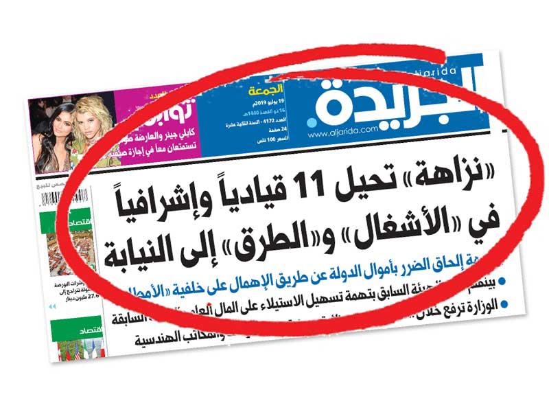 تأكيداً لما انفردت بنشره "الجريدة" قبل ثلاثة أيام، أعلنت الهيئة العامة لمكافحة الفساد "نزاهة" أمس، إحالة 3 قياديين و7 مديرين ورؤساء أقسام في وزارة الأشغال العامة والهيئة العامة للطرق والنقل البري ونائب رئيس مجلس إدارة شركة خاصة إلى النيابة على خلفية قضية تجمع الأمطار بالطرق وتطاير الحصى.وقال المتحدث الرسمي للهيئة الأمين العام المساعد لكشف الفساد والتحقيق د. محمد بوزبر لـ"كونا"، إن قطاع كشف الفساد تلقى بلاغاً من وزيرة الأشغال وزيرة الدولة لشؤون الإسكان جنان بوشهري مرفقاً به مستندات وتقارير بشأن الواقعة محل البلاغ، وتم قيد البلاغ في سجل حصر البلاغات بالهيئة.وأضاف د. بوزبر، أن الواقعة تلخص ما ورد في التقرير المقدم من وزيرة الأشغال بشأن نتيجة التقرير النهائي للجنة تقصي الحقائق حول الآثار الناجمة عن تجمع الأمطار بالطرق والشوارع وكذلك طفح مجارير الصرف الصحي.ولفت إلى أن هناك تقارير أخرى تحصلت عليها الهيئة بشأن نفس الموضوع، منها نتيجة تقرير اللجنة الفنية القانونية المستقلة للتحقيق في ظاهرة تطاير الحصى والعيوب الأسفلتية الأخرى على طرق البلاد.