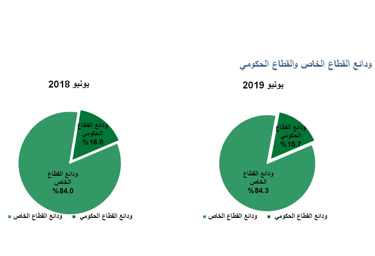 وفق «بيتك»، ارتفعت حصة الودائع للقطاع الخاص حين مثلت حصة قدرها 84.3% من إجمالي الودائع في يونيو الماضي مقارنة مع 84% في يونيو 2018، في حين تراجعت حصة ودائع القطاع الحكومي إلى 15.7% من إجمالي الودائع مقارنة مع 16% في يونيو 2018.