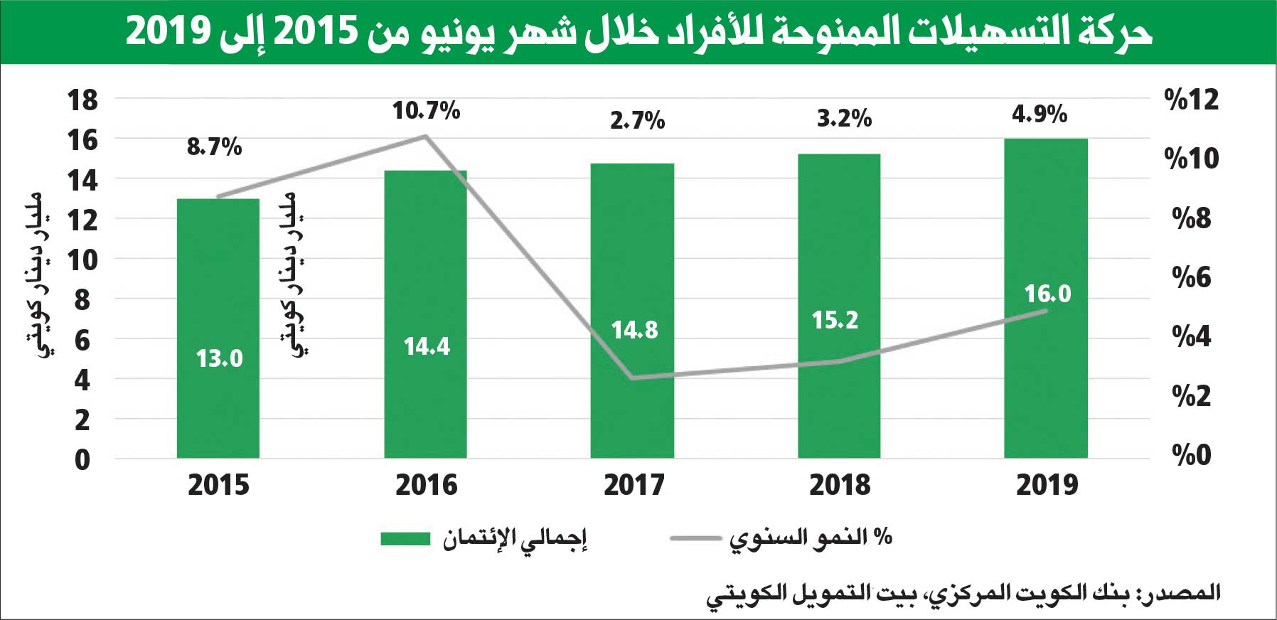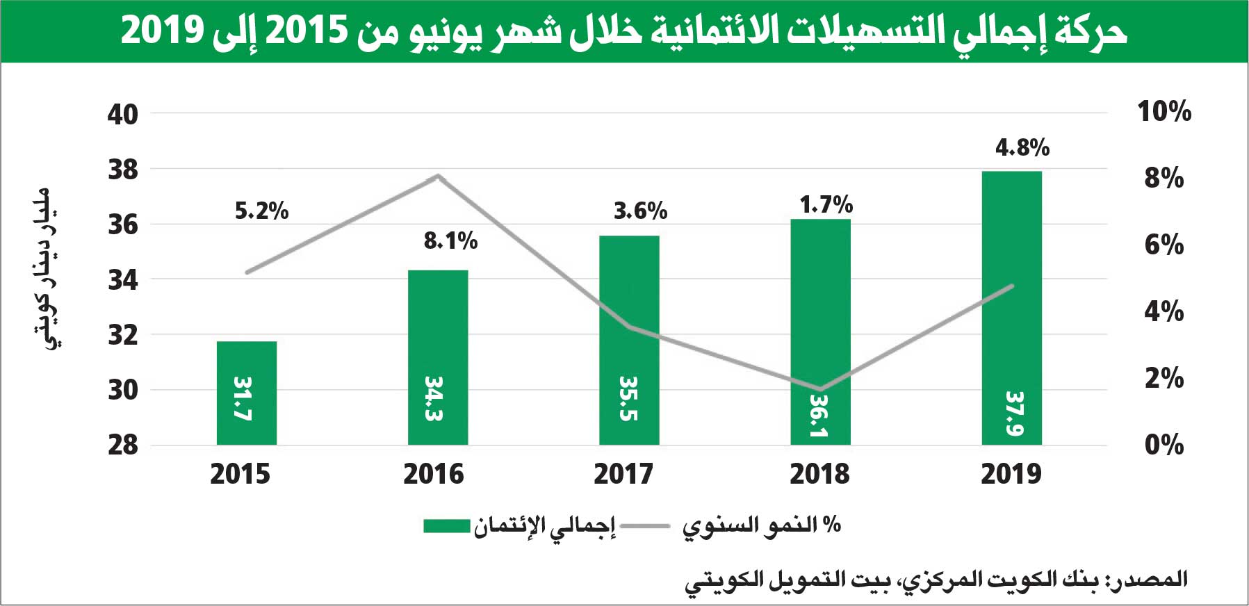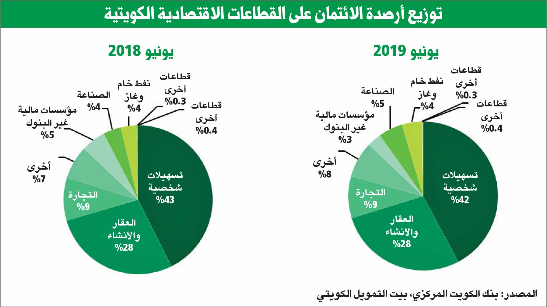 وارتفع أيضاً كل من قطاع التجارة وقطاع الزراعة وصيد الأسماك بنمو بلغت قيمته 12.6 مليون دينار و2.6 مليون دينار، على التوالي، أي بنسبة نمو قدرها 0.4 في المئة و16 في المئة، على التوالي. وتراجعت على أساس سنوي التسهيلات الموجهة لقطاع النفط الخام والغاز وإلى قطاع المؤسسات المالية غير البنوك وإلى قطاع الخدمات العامة أيضاً، وبلغت قيمة التراجع نحو 139.1 مليون دينار و27.1 مليون دينار و2.2 مليون دينار، على التوالي، أي بنسبة تراجع بلغت نحو 8 في المئة و2.3 في المئة و1.9 في المئة على التوالي.وتعتبر المدخرات التي تمتلكها البنوك كودائع مصرفية لديها سواء بالعملة المحلية أو العملات الأجنبية المصدر الرئيسي لتمويل الأنشطة الاقتصادية والتجارية المختلفة، بينما تتباين حصة كل قطاع من ذلك التمويل الممنوح إليهم، ويظهر الشكل التالي توزيع حصص الائتمان بحسب كل قطاع على حدة.وتشكل التسهيلات الائتمانية الشخصية إضافة إلى الموجهة لقطاعي العقار والإنشاء الحصة الأكبر من حجم التسهيلات الائتمانية، إذ بلغت حصة التسهيلات الائتمانية الشخصية في يونيو الماضي 42.2 في المئة من إجمالي الائتمان الممنوح، وهي أعلى بنحو طفيف من إجمالي الائتمان في العام الماضي البالغ نحو 42.1 في المئة (وذلك لارتفاع إجمالي الائتمان بنحو 4.8 في المئة وارتفاع التسهيلات الائتمانية الشخصية بنسبة مقاربة قدرها 4.9 في المئة).واستقرت حصة الائتمان الممنوح لقطاعي العقار والإنشاء معاً عند حدود 28 في المئة من إجمالي الائتمان الممنوح في يونيو 2019، مقارنة مع نفس الشهر من العام الماضي، بالتالي ارتفعت حصة القطاعات الثلاثة بنحو طفيف عن حصتها في إجمالي الائتمان حين بلغت 70.2 في المئة في يونيو الماضي مقابل 70 في المئة في نفس الشهر من عام 2018، بسبب ارتفاع حصة الائتمان الممنوح للتسهيلات الشخصية من إجمالي الائتمان كما أسلفنا سابقاً.وتمثل التسهيلات الائتمانية الشخصية ذلك التمويل الممنوح للأشخاص بغرض تمويل أغراض فردية تختلف باختلاف احتياجاتهم المتنوعة، ويمكن تقسيمها بحسب الغرض الممنوحة له إلى أربعة أنواع، الأول يضم التسهيلات المقسطة وتمثل الحجم الأكبر من التسهيلات الائتمانية الممنوحة للأفراد، وتمنح لتمويل حاجات غير تجارية على وجه الخصوص شراء أو ترميم السكن الخاص، تراجعت حصتها من التسهيلات الشخصية إلى 73.8 في المئة في يونيو 2019 مقارنة مع 74.3 في المئة في يونيو 2018.وشكل النوع الثاني من حيث الحجم في التمويل الموجه لشراء أوراق مالية وهي تسهيلات شخصية تمنح بغرض شراء أوراق مالية، وتمثل حصتها 16.1 في المئة من التسهيلات الائتمانية الشخصية أي أقل من حصتها التي شكلت 16.6 في المئة من التسهيلات الائتمانية الشخصية في يونيو 2018. أما التمويل الاستهلاكي النوع الثالث فإنه يشكل 7.7 في المئة من التسهيلات الائتمانية الشخصية في يونيو 2019 أعلى من حصتها التي مثلت 6.8 في المئة في يونيو 2018، وهي تمنح للعميل لتمويل حاجاته الشخصية التي تغطي نفقات التعليم والعلاج كذلك احتياجاته من السلع المعمرة. وحافظت حصة القروض الشخصية الأخرى على حصتها التي شكلت 2.3 في المئة من التسهيلات الائتمانية الشخصية في يونيو 2019 مقارنةً مع نفس الحصة في يونيو 2018.وسجلت التسهيلات الائتمانية المقسطة 11.8 مليار دينار مرتفعة بنسبة 4.2 في المئة عن حجمها في يونيو 2018. أما على أساس شهري فارتفعت بنسبة ضئيلة بلغت 0.03 في المئة مقارنة مع شهر مايو 2019.وارتفعت التسهيلات الشخصية الموجهة لشراء أوراق مالية إلى 2.6 مليار دينار أي بنسبة نمو 2.2 في المئة على أساس سنوي في يونيو 2019، في حين ارتفعت بنسبة شهرية بلغت 4.6 في المئة عند المقارنة مع 2.5 مليار دينار في مايو من عام 2019. القروض الشخصية الاستهلاكية يحصل عليها الأفراد لتمويل شراء السلع المعمرة أو لتغطية تكاليف العلاج والتعليم، إذ إن مستويات الائتمان الممنوح لهذا الغرض بلغ 1.22 مليار دينار في يونيو 2019 مرتفعة بنسبة 18.3 في المئة عن 1.0 مليار دينار في يونيو عام 2018، بينما ارتفعت بنحو 2.2 في المئة على أساس شهري مقا