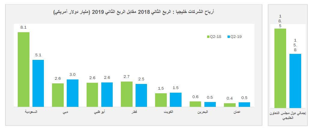 سجلت السعودية أعلى نسبة تراجع في إجمالي أرباح الشركات المدرجة على مستوى نظيراتها الخليجية وسط انخفاض إجمالي أرباحها بواقع 3.0 مليارات دولار ووصوله إلى 5.1 مليارات في الربع الثاني من عام 2019 منخفضاً من 8.1 مليارات في الربع الثاني من عام 2018.