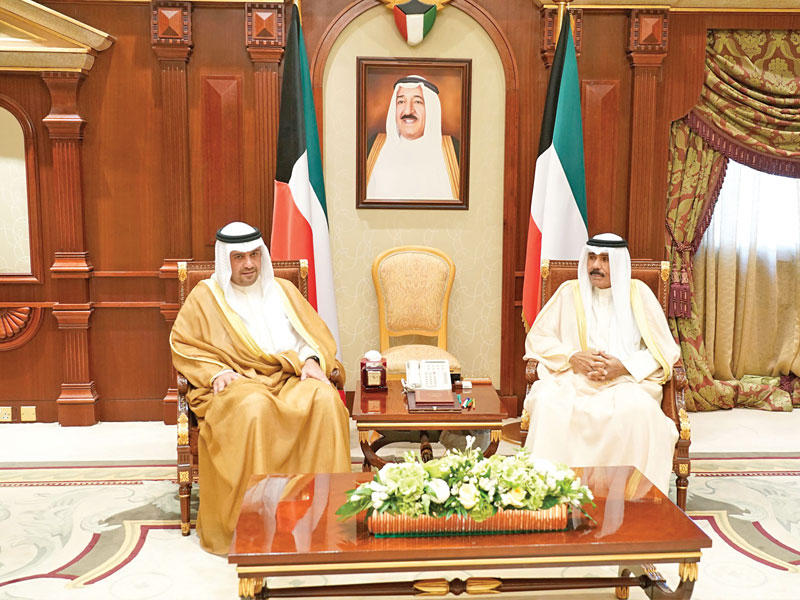 استقبل سمو نائب الأمير ولي العهد الشيخ نواف الأحمد بقصر بيان، أمس، رئيس مجلس الأمة مرزوق الغانم.واستقبل سموه أيضاً، رئيس مجلس الوزراء سمو الشيخ جابر المبارك، ثم نائب رئيس مجلس الوزراء وزير الخارجية الشيخ صباح الخالد.