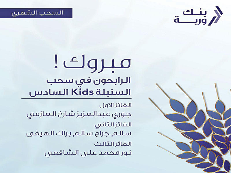أعلن بنك «وربة» الفائزين الخمسة في سحب السنبلة الأسبوعي الرابع والثلاثين، إضافة إلى سحب السنبلة الخاص بالأطفال، يوم الخميس الماضي، بحضور ممثل عن وزارة التجارة والصناعه وموظفي البنك. وقال البنك في بيان صحافي أمس، إنه بالنسبة للعملاء الذين حالفهم الحظ خلال سحب السنبلة الـ 34، فقد توج 5 رابحين من عملاء بنك وربة حصل كل منهم على 1000 دينار هم: وفاء ريكان عبد الرحمن الخالدي، وشيخة مشعل طامي المطيري، وموزة فرج فالح الشمري، وعلاء حسن علي الجابر، ومحمد حمود سلمان العازمي.وللمرة الأولى تمت إضافة حساب السنبلة للأطفال إلى سحوبات السنبلة وهو حساب توفير للأطفال يتميز بعوائد تنافسية وسحوبات شهرية على جوائز مبتكرة للصغار، وقد توج 3 فائزين هذا الشهر، الرابحة الأولى برحلة شاملة أفراد الأسرة والإقامة في فندق La Pita الكائن في «دبي باركس» جوري عبدالعزيز شارخ العازمي، والرابح بالجائزة الثانية هو سالم جراح سالم براك الهيفي وهي عبارة عن اشتراك سنة في نادي فلكس، والفائزة الثالثة نور محمد علي الشافعي باشتراك مدة سنة في أحد النوادي المشاركة.