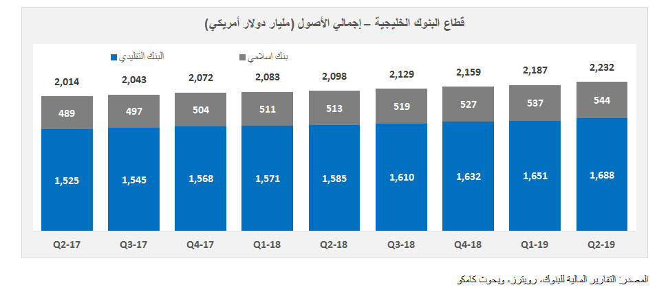 سجل قطاع البنوك في دول مجلس التعاون الخليجي أحد أكبر معدلات نمو إجمالي الأصول خلال الربع الثاني من عام 2019 بقيمة إجمالية بلغت 2.23 تريليون دولار. وسجلت الأصول نمواً على أساس ربع سنوي بنسبة 2.0 في المئة، بينما بلغ معدل النمو السنوي 6.4 في المئة فيما يعد من أعلى المعدلات المسجلة على مدى الفترات الربع سنوية القليلة الماضية. ويعزى النمو في المقام الأول إلى نمو أصول البنوك التقليدية التي سجلت ارتفاعاً بنسبة 2.3 في المئة مقارنة بالربع السابق. بينما ارتفعت الميزانيات العمومية للبنوك الإسلامية بنسبة 1.3 في المئة. وكان نمو الأصول المدرة للدخل أقل هامشياً، إذ سجل نمواً بنسبة 1.3 في المئة بقيمة اجمالية بلغت 1.86 تريليون دولار، بما يشير إلى تسجيل الأصول غير المدرة للدخل لمعدل نمو أعلى نسبياً، كما بلغ معدل نمو صافي القروض 0.9 في المئة في الربع الثاني من عام 2019 وصولاً إلى 1.36 تريليون دولار بعد ارتفاعه بأكثر من الضعف خلال الربع السابق.