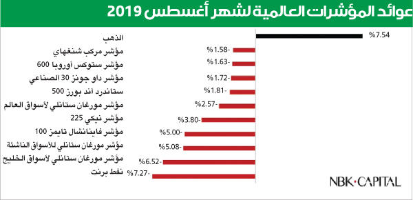 من ناحية أخرى، أشار تقرير الوطني إلى أن الأسواق العالمية ظلت تحت ضغط خلال شهر أغسطس وسط استمرار التوترات التجارية والمخاوف من أن تؤدي إلى تباطؤ في الاقتصاد العالمي، إذ تراجع مؤشر MSCI AC World بنسبة 2.57 في المئة خلال شهر أغسطس، في حين انخفض مؤشر MSCI EM (للأسواق الناشئة) بنسبة 5.08 في المئة، مما قلص مكاسبه السنوية إلى 1.92 في المئة بانخفاض من 7.38 في المئة، كما في نهاية الشهر الماضي. وكان الانخفاض الحاد في الأسواق الناشئة مدفوعاً بمخاوف تباطؤ النمو والتوترات التجارية خصوصاً بعد تخفيض تصنيف الأرجنتين وتأثير زيادة التعريفات الجمركية على الاقتصاد الصيني واستقرار العملة.وبدأت آثار التوترات التجارية تنعكس على الاقتصاد الأميركي إذ تم تعديل الناتج المحلي الإجمالي للربع الثاني من عام 2019 بشكل هامشي إلى 2.0 في المئة من 2.1 في المئة سابقاً مقارنة بـ 3.1 في المئة للربع الأول من عام 2019. ويعود السبب في التراجع بشكل أساسي إلى انخفاض الصادرات والاستثمارات على الرغم من الزيادة الكبيرة في مصروفات المستهلكين التي ارتفعت بنسبة 4.7 في المئة. بذلك يكون الناتج المحلي الاجمالي ارتفع بنسبة 2.6 في المئة خلال النصف الأول من العام الحالي. وأغلقت المؤشرات الأميركية الرئيسية شهر أغسطس في المنطقة الحمراء.الأسواق الأوروبية