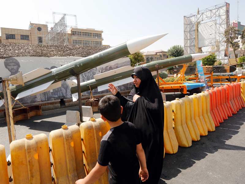 إيرانية وطفلها بجوار صواريخ نشرها الجيش ضمن احياء ذكرى الحرب العراقية وسط طهران أمس (أي بي أيه)