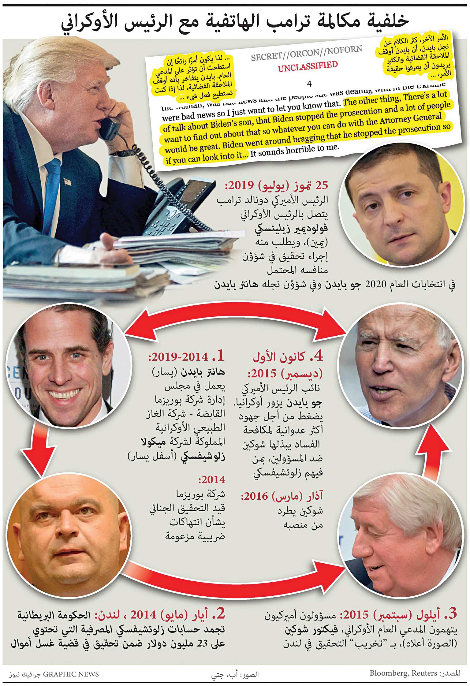 وإن كانت فرص عزله تبقى ضئيلة في ظل الأغلبية الجمهورية في مجلس الشيوخ، لكن الخطر يبقى جسيماً إلى حد يتطلب منه تعبئة مؤيديه.ودعا الجمهوريين في تغريدة محاها لاحقاً إلى «البقاء موحدين وإلى القتال لأن مستقبل بلادنا على المحك».ويواجه الملياردير النيويوركي أزمة خطيرة بسبب مكالمة هاتفية أجراها خلال الصيف مع الرئيس الأوكراني فولوديمير زيلنسكي وطلب منه خلالها التحقيق حول بايدن، في وقت تشير استطلاعات الرأي إلى أن نائب الرئيس السابق هو المرشح الديمقراطي الأوفر حظاً لهزم الرئيس في انتخابات 2020.ويرى الديمقراطيون في هذا الاتصال «سوء استخدام للسلطة» على قدر من الخطورة يبرر الشروع بآلية عزل لا تستخدم سوى في حالات نادرة جداً.ورد ترامب ببناء دفاع يقوم على ثلاثة عناصر، هي: تأكيد براءته وطرح نفسه في موقع الضحية وتوجيه التهمة إلى بايدن.ويردّد ترامب منذ أسبوع أن اتصاله بزيلنسكي كان «خالياً من أي شوائب وقانونياً تماماً و«عادياً».ورداً على تحركات عزله، اعتبر ترامب أن «الديمقراطيين الآن سيعرفون الحزب الذي لا يفعل شيئاً».