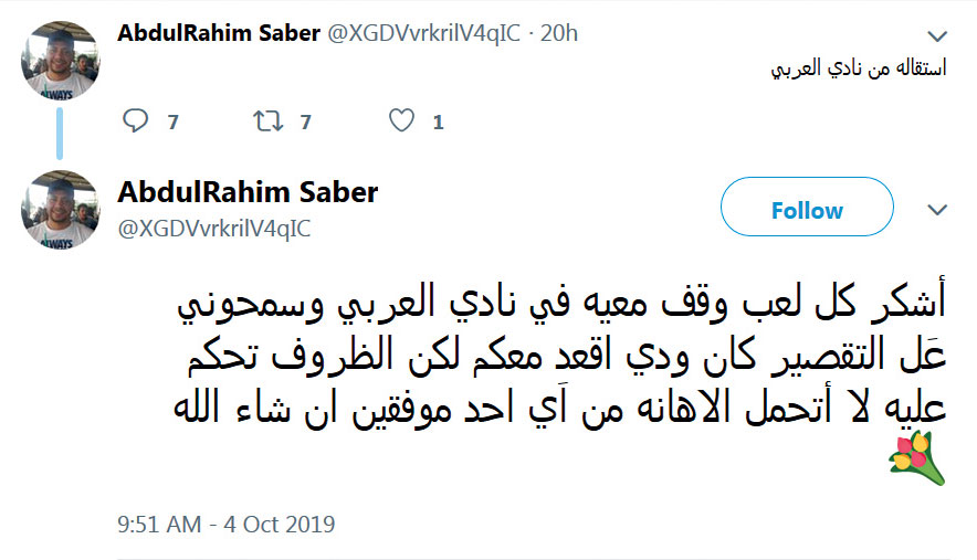 أعلن مدلك واختصاصي العلاج الطبيعي بالفريق الأول لكرة القدم بالنادي العربي عبدالرحيم صابر استقالة من الطاقم الطبي للفريق، اعتراضا على أمر إخلائه من سكنه الخاص بالنادي.وأكد صابر عبر حسابه في برنامج التواصل الاجتماعي تويتر أنه يتمنى الاستمرار مع الأخضر، لكن الظروف تحكم ألا أتحمل الإهانة من أي شخص.وتقدم صابر بالشكر للأشخاص الذين ساندوه ووقفوا معه طوال الفترة الماضية، في حين تلقى عرضا سريعا من أحد أندية الدوري الممتاز التي ترغب في التعاقد معه وانضمامه للطاقم الطبي لفريقها.