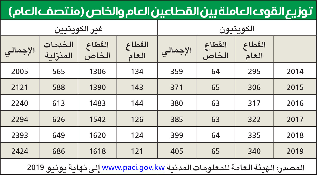 شهد معدل نمو التوظيف تباطؤاً ملحوظاً من 4.2% في 2018 على أساس سنوي، إلى 3.7% في يونيو 2019 (أقل بكثير من المعدلات في 2015-2016)، ويرجع ذلك بشكل رئيس إلى استمرار التراجع في أعداد الوافدين في القطاع العام (3.1%- على أساس سنوي)، بسبب جهود التكويت. وبقي نمو وظائف الكويتيين قوياً عند 3.5% مقارنة بالسنة السابقة، بينما تباطأ نمو توظيف الوافدين من 4.3% في 2018 إلى 3.7% في يونيو 2019، على أساس سنوي.توظيف الوافدين