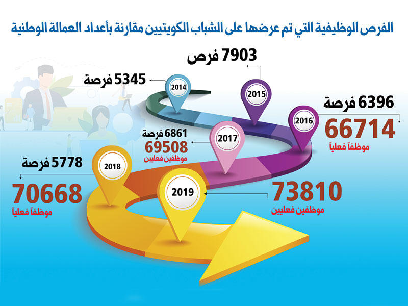 بأرقام حمراء تدق ناقوس الخطر، كشفت إحصائية حكومية أن نحو 59% من شباب الكويت رفضوا خلال عام 2017 العمل في القطاع الخاص، ثم قفزت تلك النسبة إلى 80% العام الماضي. وكشفت هذه الإحصائية، التي جاءت ضمن رد على سؤال برلماني للنائب عبدالله الكندري، حصلت «الجريدة» على نسخة منه، أن الهيئة العامة للقوى العاملة عرضت في 2017 على الخريجين الشباب 6861 فرصة وظيفية في «الخاص»، لافتة إلى أن 4067 شاباً منهم رفضوا تلك الفرص، ولم يوافق إلا 2794.وأظهرت أن عدد الفرص الوظيفية التي عرضت على الشباب في 2018 يبلغ 5778 فرصة، غير أن 4618 منهم رفضوا الالتحاق بها بنسبة 80%، ولم يقبلها إلا 1160 خريجاً.