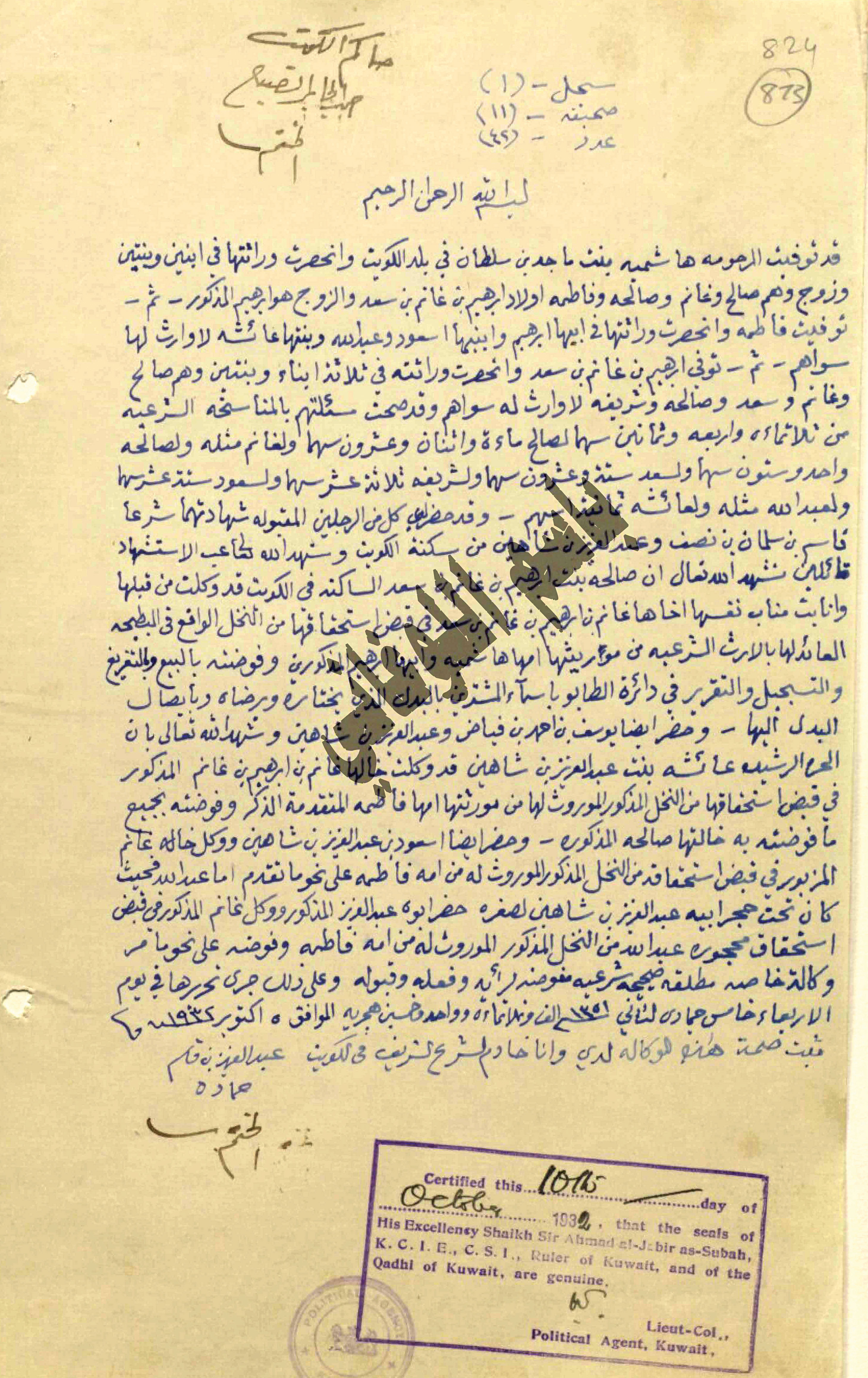وثيقة جديدة من وثائق أهل الكويت المتعلقة بأملاكهم في العراق نعرضها لكم اليوم في هذه الزاوية الأسبوعية. الوثيقة جزء من أربع وثائق كتبت في شهر أكتوبر عام 1932م، وتتعلق بوفاة الكويتية "هاشمية بنت ماجد بن سلطان"، وزوجها "إبراهيم بن غانم بن سعد"، وما تركا من بعدهما من ملك في مدينة البصرة. تقول الوثيقة الأولى، التي كتبها الشيخ عبدالعزيز بن قاسم حمادة، وصادق عليها الشيخ أحمد الجابر الصباح، والمعتمد البريطاني في الكويت، إن هاشمية توفيت وتركت من بعدها زوجها إبراهيم والأبناء صالح وغانم وصالحة وفاطمة، ثم توفيت الابنة فاطمة ولها من الورثة والدها إبراهيم وأبناؤها سعود وعبدالله وعائشة. بعد ذلك وخلال فترة قصيرة، توفي الأب إبراهيم بن غانم بن سعد، وله من الذرية ثلاثة أبناء وابنتان، واقتضى ذلك أن تتم تسوية حصص الورثة بطريقة حسابية معقدة، فتم ذلك وشهد على حصر الورثة وتسوية الحصص شهود من أهل الكويت لهم معرفة تامة ووثيقة بهذه الأسرة الكريمة. نبدأ القراءة بالوثيقة كما يلي: