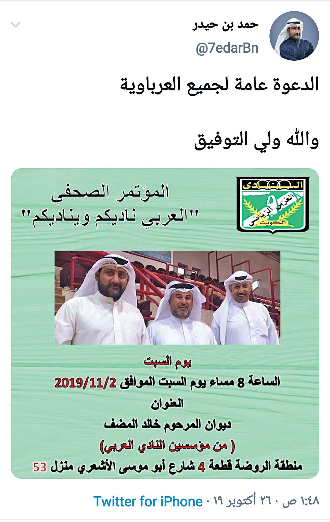 وقد أعلن الثلاثي عقد مؤتمر صحافي يوم السبت المقبل في ديوان المرحوم خالد المضف "أحد مؤسسي النادي العربي" في منطقة الروضة بعنوان "العربي ناديكم ويناديكم" موجهين الدعوة لكل العرباوية.وأكدت مصادر مقربة من "الثلاثي" أن سبب الانقسام هو الاعتراض الواضح على سياسة رئيس النادي في الإدارة، وعقب الوصول إلى طريق مسدود في محاولات التصحيح لعدة قرارات، ابتداء من الطريقة المعتمدة في فترة التسجيل والتسديد لأعضاء الجمعية العمومية بالنادي، التي اتخذها الرئيس ومؤيدوه في فبراير ومارس الماضيين، والانتقائية في ذلك لمحاولة تصفية الطرف الآخر وعرقلة تسجيل الأطراف المنافسة، واستخدام السلطة للسيطرة التامة على النادي من خلال السيطرة على الجمعية العمومية وصولاً إلى شطب بعض أعضاء الجمعية وإخضاعهم للتحقيقات في سياسة واضحة لتكميم الأفواه، وقتل الرأي الآخر ومنعهم من التعبير عن انتقاداتهم، وقد سجل "الثلاثي" مواقفهم الرافضة لهذه السياسة في محاضر اجتماعات سابقة لمجلس الإدارة.