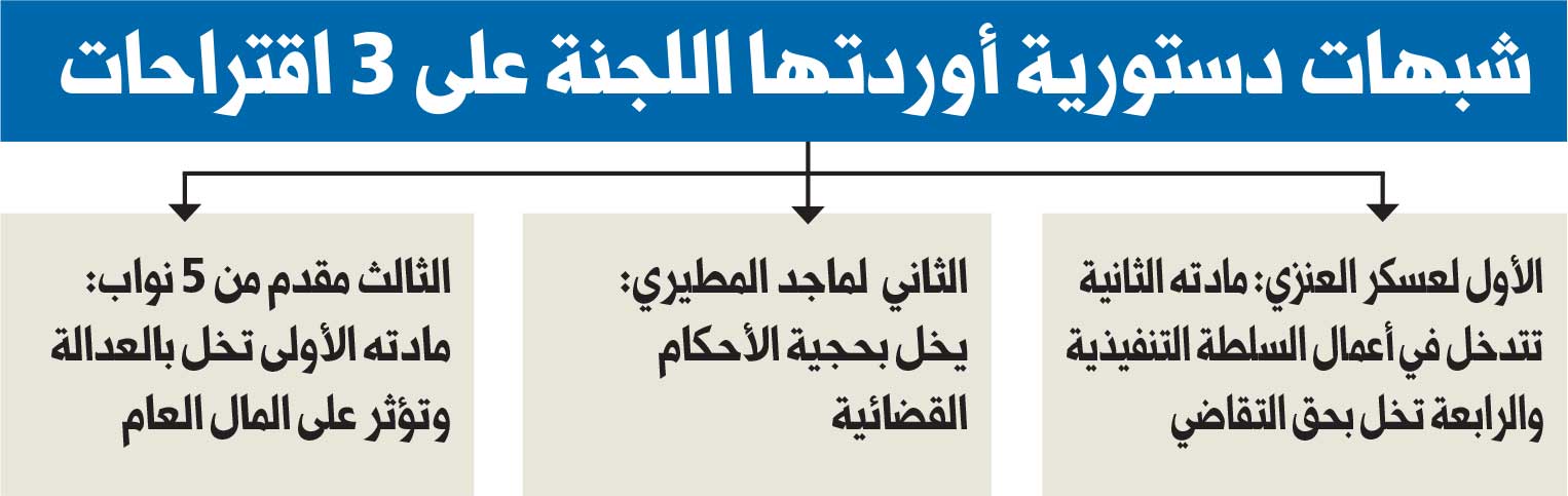 في حين وافقت اللجنة التشريعية والقانونية البرلمانية على 4 اقتراحات، أحدها يتحدث عن إسقاط القروض والفوائد، والثلاثة الباقية تنظم مسألة السداد، وضعت اللجنة ملاحظات جذرية تنبه إلى شبهة عدم دستورية بعض المواد الواردة في ثلاثة من تلك الاقتراحات، ليكون اقتراح النائب صالح عاشور الذي يتحدث عن تسديد القروض من خلال وقف صرف علاوة غلاء المعيشة، هو الوحيد الذي مرَّ بلا ملاحظات عليه. الاقتراح الأول المقدم من النائب عسكر العنزي، الذي ينص على «محاسبة البنوك التي خالفت تعليمات البنك المركزي بشأن سعر الفائدة على القروض الممنوحة للمواطنين خلال الفترة من عام 1998 حتى 2016»، وافقت اللجنة عليه بإجماع الحضور، لكنها، في تقريرها الذي حصلت «الجريدة» على نسخة منه، أبدت عليه ملاحظتين دستوريتين.ورأت اللجنة، في التقرير، أن الملاحظة الأولى على هذا الاقتراح أنه يتضمن تدخلاً في أعمال السلطة التنفيذية، حيث ألزمت مادته الثانية مجلس الوزراء بإصدار قرار لتشكيل لجنة من أجل بحث ملفات القروض، مما يترتب عليه مخالفة المادة 50 من الدستور، مشيرة إلى أنه لإزالة هذا العيب يجب أن يكون نص هذه المادة كالتالي: «تشكل لجنة تتولى البحث والتحقيق في مدى التزام البنوك المحلية بتنفيذ تعليمات وقرارات بنك الكويت المركزي».أما الملاحظة الثانية، فبينت «التشريعية» فيها أنه يترتب على المادة الرابعة من اقتراح عسكر الإخلال بمبدأ حق التقاضي المكفول بالدستور، لنصها على أن يكون حق اعتراض البنوك المخالفة على قرار لجنة بحث ملفات القروض بكتاب مسبب إليها، ويكون قرار اللجنة نهائياً ونافذاً، لافتة إلى ضرورة إضافة فقرة أخيرة تكفل حق التقاضي.