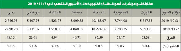 وبعد تراجع لأكثر من أسبوعين عاد مؤشر سوق قطر، وحقق نموا بنسبة جيدة كانت 0.8 في المئة تعادل 85.59 نقطة، ليقفل على مستوى 10274.56 نقطة، ويعود كحال مؤشر "تاسي" السعودي الى نقطة الأساس التي انطلق منها هذا العام دون خسائر أو مكاسب تذكر، وتحركت الأسواق العالمية بنهاية الأسبوع الماضي الى أعلى، وحققت مؤشرات الأسواق الأميركية الرئيسية قمما تاريخية جديدة لم تبلغها مسبقا، واستطاعت أن تخترق مقاوماتها التاريخية بعد أخبار اتفاق الولايات المتحدة والصين، الذي أشار الى خفض الضرائب على بضائع الاقتصادين الكبيرين، كما ارتفعت أسعار النفط، وأنهت اسبوعها على مكاسب بنسبة 3 في المئة، بينما تراجعت اسعار الذهب، محققة أكبر خسارة في عامين وبنسبة 3 في المئة، وهي مؤشر على تحسّن حالة الأسواق والتفاؤل بالاقتصاد العالمي، بالرغم من خفض أسعار الفائدة الأميركية 3 مرات خلال هذا العام، وهو إجراء ينم عن نظرة اقتصادية متشائمة للاقتصاد الأكبر في العالم.
