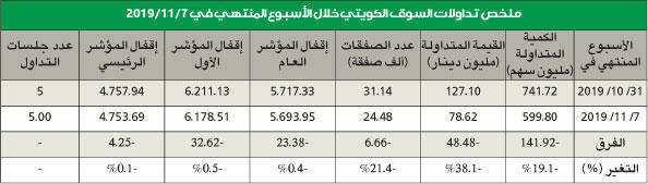 تراجعت مؤشرات ومتغيرات بورصة الكويت خلال تعاملات الأسبوع الماضي، وهو الأول لشهر نوفمبر، حيث خسر مؤشر البورصة العام بنسبة 0.4 في المئة تعادل 23.38 نقطة، ليقفل على مستوى 5693.25 نقطة، وخسر كذلك مؤشر السوق الأول "وهو المؤشر الذي يحوى 19 شركة قيادية" بنصف نقطة مئوية تعادل 32.62 نقطة، ليقفل على مستوى 6178.71 نقطة، وكانت خسائر المؤشر الرئيسي أقل ولم تتجاوز عُشر نقطة مئوية فقط هي 4.25 نقاط، ليقفل على مستوى 4753.69 نقطة.