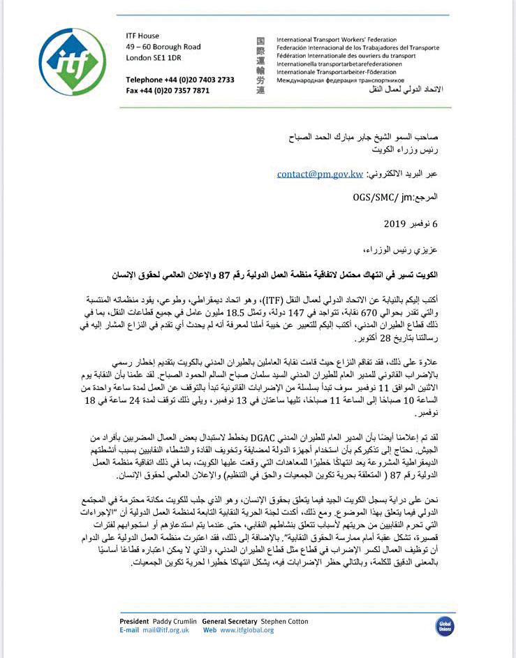 بدوره، أعلن الأمين العام للاتحاد الدولي لعمال النقل ستيفن كوتون مساء أمس الأول، تأييده ودعمه إضراب نقابة العاملين في الطيران المدني المزمع عقده في يومه الأول غداً ساعة، وساعتين الأربعاء المقبل، ويوماً كاملاً 18 الجاري، داعياً إلى عدم انتهاك اتفاقية منظمة العمل الدولية رقم 87 "المتعلقة بحرية تكوين الجمعيات والحق في التنظيم" والإعلان العالمي لحقوق الإنسان.وعرض كوتون في الكتاب الموجه لسمو رئيس مجلس الوزراء، على الحكومة الكويتية أن يكون الاتحاد جزءاً مشاركاً في حوار مفتوح عاجل بين الحكومة والنقابة على أمل تجنب الإضراب وتصعيد النزاع، موضحاً أن اتفاقيات منظمة العمل الدولية تحمي النقابات العمالية أثناء ممارسة حقها في الإضراب، مبيناً أنهم أبلغوا بالفعل جميع النقابات المنتسبة للاتحاد حول العالم بهذا النزاع وسوف نبقيهم على اطلاع حول هذا القرار غير الناجح حتى الآن.