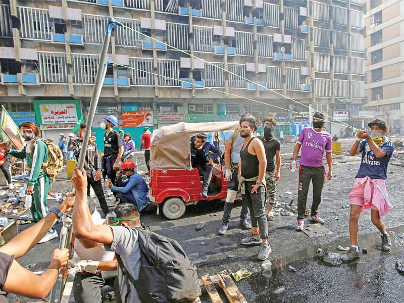 وتزامنت تلك التطورات مع تواصل الاحتجاجات والاضرابات في العاصمة وعدة محافظات بجنوب البلاد ووسطها.وتواصلت عمليات الكر والفر بين قوات مكافحة الشغب والمتظاهرين في عدة ساحات، خاصة في ساحتي التحرير والخلاني المتجاورتين وسط العاصمة.وشهدت مدينة النجف إضرابا عاماً تأييداً لمطالب المتظاهرين لإصلاح العملية السياسية في البلاد.وقال شهود عيان إن المحال التجارية في الأسواق الكبرى أغلقت أبوابها وانضم أصحابها إلى آلاف من المتظاهرين للمطالبة بإقالة الحكومة وحل البرلمان وتعديل الدستور. كما أعلنت السلطات فرض حظر تجوال شامل في الغراف إلى إشعار آخر للسيطرة على الوضع الأمني بعد وقوع صدمات بين المحتجين وقوات الأمن.خط أحمر