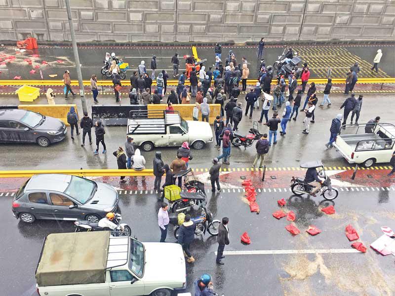 وكان مقرراً تنظيم احتجاجات حاشدة أمس في طهران ومجمل المدن الإيرانية الكبرى، لكن أدى هطول الثلوج الغزيرة إلى بقاء الناس في منازلهم، وتحولت التظاهرات التي دُعي إليها في الساعة العاشرة صباحاً، إلى تجمعات واعتصامات محدودة قام خلالها السائقون بركن سياراتهم وسط بعض الشوارع لشل الحركة قبل أن تتطور.وعمد المحتجون، في طهران، إلى قطع «أوتوستراد همت»، و«أوتوستراد حكيم» عبر إطفاء محركات السيارات، بغية الاحتجاج على رفع أسعار الوقود. كما أغلقوا «أوتوستراد إمام علي»، أحد أکبر الطرق الرئیسیة في العاصمة.احتجاجات وقتلى