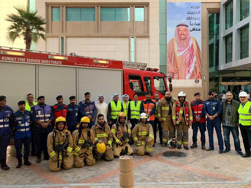 نفذت الإدارة العامة للإطفاء، ممثلة بقطاع المكافحة، وبالتعاون والتنسيق مع الإدارة العامة للعمليات المركزية، صباح أمس، تمرينا عمليا في برج بمحافظة العاصمة، وذلك من ضمن سلسلة البرامج التدريبية الخاصة بقطاع المكافحة، وشارك في التمرين مراكز إطفاء الهلالي والمدينة والإنقاذ الفني بقيادة مدير إطفاء محافظة العاصمة العقيد أحمد الرشيدي.وقال مدير إدارة العلاقات العامة والإعلام بالإدارة العامة للإطفاء، العميد خليل الأمير، إن سيناريو التمرين تمثل في تلقي غرفة العمليات بلاغا يفيد باندلاع حريق في الدور الـ 43 بأحد الأبراج في محافطة العاصمة، وفور تلقي البلاغ تم تحريك مراكز إطفاء الهلالي والمدينة والإنقاذ الفني الى الموقع، حيث تم إخلاء جميع الموظفين البالغ عددهم 2000 موظف، وعمل رجال الإطفاء كذلك على ضخ الماء إلى الطابق 43 باستخدام أنظمة الإطفاء الخاصة بالمبنى، لافتا الى أنهم استخدموا أيضا المصعد المخصص لرجال الإطفاء، ولم يتجاوز السيناريو الخاص بالتمرين 30 دقيقة.