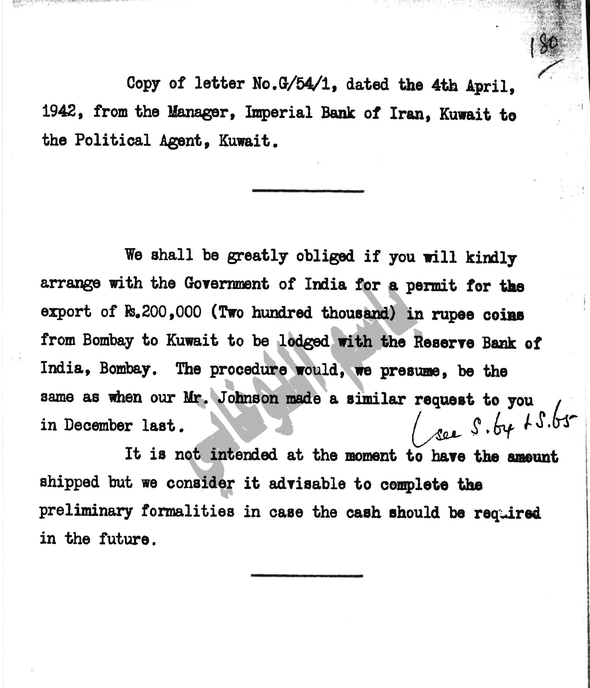 أقدِّم لكم الآن نص أول رسالة، كما أعتقد، من البنك الإمبراطوري الإيراني، بعد توقيعه الاتفاقية مع الشيخ أحمد، وهي بخصوص طلب رخصة من حكومة الهند البريطانية للسماح بتصدير مبلغ 200 ألف روبية إلى الكويت، وتاريخها 4 أبريل 1942م، وقد وجهها البنك إلى المعتمد البريطاني في الكويت: "سنكون ممنونين لكم إذا قمتم بلطف بترتيب رخصة مع حكومة الهند للسماح بتصدير 200000 روبية (مئتي ألف) معدنية من بومبي إلى الكويت من خلال بنك الاحتياط الهندي. ونعتقد أن هذا الإجراء سيكون مشابهاً لطلب السيد جونسون في ديسمبر الماضي. إنه ليس في النية حالياً أن يتم تصدير المبلغ، ولكننا نرى أهمية إنهاء الإجراءات الرسمية ليكون المبلغ جاهزاً للتصدير في المستقبل".في المقال القادم، بعون الله تعالى، سنتناول تقريراً مفصلاً عن أداء البنك في مراحله الأولى، وبعض التفاصيل المرتبطة بالتجهيز وافتتاح فرع البنك في الكويت.