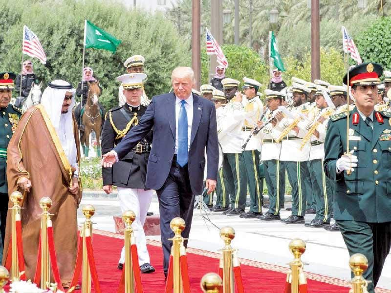 توجه ترامب الى المملكة العربية السعودية في زيارة بدأت يوم 20 مايو، وانتهت في 21 منه، ولقي ترحيبا حارا، أعلن ترامب حينها توقيع عقود بقيمة 110 مليارات دولار على شكل مشتريات دفاعية بتمويل سعودي بالإضافة الى سلة مشتريات ضخمة تضم عقودا قيمتها مليارات عدة أخرى من الدولارات وبالطبع كان الرقم مبالغا فيه.اعتبر هارفي أن هذه القمة قد اعادت ترتيب العلاقات بطريقة مثيرة، وأسفرت عن ارسال رسالة استراتيجية الى إيران الخصم الرئيسي في المنطقة، كانت القمة بنتائجها تعني توحيد جهود السعوديين ودول مجلس التعاون الخليجي.روبرت لايتيزر ونافارو يقدمان لترامب البرنامج الزمني للتجارة