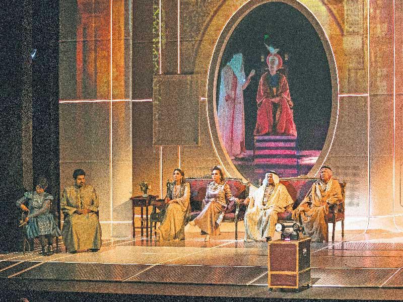 سرعان ما جاءت الإجابات تباعا منذ رفع ستار مسرح الدراما في مركز جابر عن العرض الأول عند الساعة الثامنة يوم الأربعاء الماضي، كنا أمام سينوغرافيا مبهرة، ديكورات ضخمة تم تصميمها لتخدم فكرة العمل الذي تدور أحداثه في كوكب المريخ، وهنا تم توظيف إمكانات المركز بكامل طاقتها، بداية من الديكورات المتحركة، ومرورا بالإضاءات وما تحمل من دلالات، وكذلك الشاشات التي عرضت مشاهد تمثيلية تخدم السياق الدرامي للأحداث، بينما اعتمد المخرج كذلك الإيقاع السريع والجمل الحوارية القصيرة، والانتقال من مشهد لآخر على وقع استعراض صغير لمجموعة التعبير الحركي التي كانت همزة الوصل بين المشاهد المختلفة.كذلك أجاد ويبر توظيف موهبة ولاء الصراف التي ظهرت في مشاهد معدودة بشخصية هالة، لكنها لعبت دورا مهما بصوتها في الربط بين المشاهد، وهنا يجب أن نتوقف عند فكرة الغناء لايف على المسرح، وقلّما نشاهد هذا التوجه في الأعمال المسرحية الجماهيرية التي يعتمد أغلبها على الأغنيات المسجلة، وهي خطوة تُحسب للمخرج ويبر، الذي قدّم أيضا لوحتين إحداهما من روح التراث الهندي وأخرى من الموروث العربي.قالب الفانتازيا