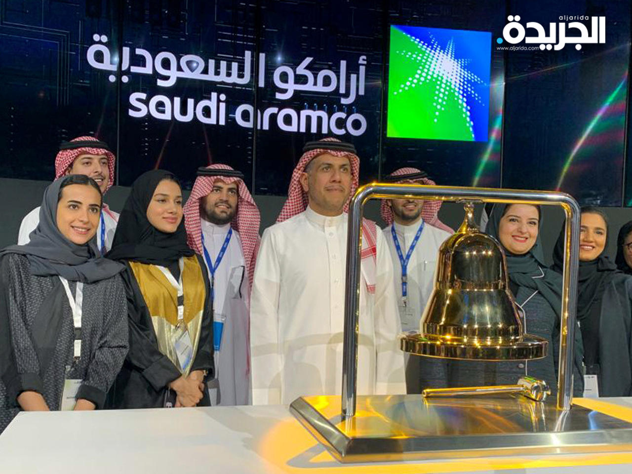 واعتبر أنّه «في هذا اليوم، يحق لموظفي أرامكو السعودية كافة وكل شخص في المملكة أن يشعر بالفخر والاعتزاز».وبعد قرع مسؤولي أرامكو جرس بدء التداول، ارتفع سعر السهم إلى أعلى حد يسمح به في اليوم الواحد هي نسبة 10%، بحسب أنظمة السوق.ويعزز اكتتاب أرامكو موقع السوق المالية السعودية المحلية «تداول»، التي تصبح من بين أكبر عشر أسواق عالمية.ودخلت أرامكو السوق بعدما استكملت أكبر اكتتاب عام في التاريخ، قامت فيه الشركة ببيع 1.5% من أسهمها بقيمة 25.6 مليار دولار، قبل أن تقرّر في وقت لاحق بيع 0.25% إضافية لترتفع قيمة ما قد تجنيه من عملية البيع إلى 29.44 مليار دولار.والاكتتاب العام لجزء من أسهم أرامكو هو حجر الزاوية في برنامج الإصلاح الاقتصادي لولي العهد الأمير محمد بن سلمان المسمّى «رؤية 2030». يسعى المسؤولون إلى استقطاب عشرات مليارات الدولارات لتمويل مشاريع ضخمة ضمن هذا البرنامج الطموح الذي يهدف إلى تنويع الاقتصاد ووقف ارتهان المملكة التاريخي للنفط.وتجاوز الاكتتاب العام أرامكو مبلغ 25 مليار دولار الذي كانت سجلته مجموعة علي بابا الصينية في 2014 لدى دخولها إلى بورصة وول ستريت.وكان من المتوقع أن تبيع أرامكو 5% من أسهمها في السوق المالية المحلية وبورصة أجنبية لم تتحدّد، لكنّها أعلنت مؤخّراً أن خطط الطرح خارج السعودية مؤجّلة.وتأجّلت عملية الطرح في مرات عديدة بسبب إصرار ولي العهد على تقييم الشركة بتريليوني دولار، وهي عتبة قد تصلها في حال استمر ارتفاع سعر السهم في الأيام المقبلة.ويبلغ رأسمال أرامكو ستين مليار ريال سعودي «16 مليار دولار» مقسّمة على مئتي مليار سهم، وباعت أرامكو ثلاثة مليارات سهم في البداية، ثم قرّرت بيع 450 مليون إضافية.وحاولت السلطات تحفيز السوق المحلية على الاكتتاب في الشركة قبل عملية الطرح، وذلك عبر دعوة العائلات الثرية إلى شراء حصص، بينما روّجت وسائل إعلام محلية لعملية الشراء على أنّها عمل وطني.حتى أن الحكومة قامت بضخ أموال هائلة في عملية الاكتتاب العام عبر شراء 13.2% من اجمالي الأسهم المخصّصة للمؤسسات بقيمة 2.3 مليار دولار، على الرغم من أن الهدف من عملية البيع هو تحصيل أموال إضافية لصالح تمويل المشاريع الكبرى.وينظر إلى أرامكو على أنّها الدعامة الرئيسية لاقتصاد المملكة ولاستقرارها الاجتماعي.وقد حقّقت الشركة العملاقة أرباحاً صافية بلغت 111 مليار دولار العام الماضي، لتتفوق على أكبر خمس شركات نفطية عالمية، وبلغت عائداتها 356 مليار دولار.وتقدّر أرامكو احتياطات النفط المثبتة السعودية بـ227 مليار برميل، واحتياطات الهيدروكربون بـ257 مليار برميل.
