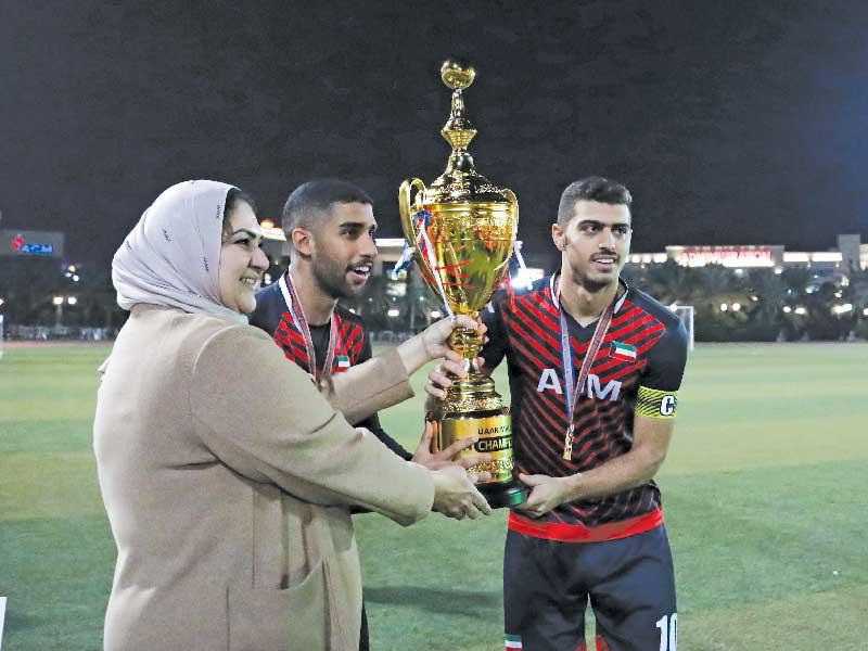 تتواصل مسيرة الإنجازات التي يحقّقها طلاب جامعة الشرق الأوسط الأميركية (AUM) على المستوى الرياضي، فقد توّج فريق الجامعة لكرة القدم، للمرة الثانية على التوالي ومن دون تسجيل أي خسارة، بطلاً لدوري الجامعات الخاصة في الكويت (UAAK)، بعد مباراة حماسية جمعته بنظيره من الجامعة العربية المفتوحة (AOU)، التي انتهت بنتيجة 2-0، أمس الأول في حرم الجامعة بالعقيلة.