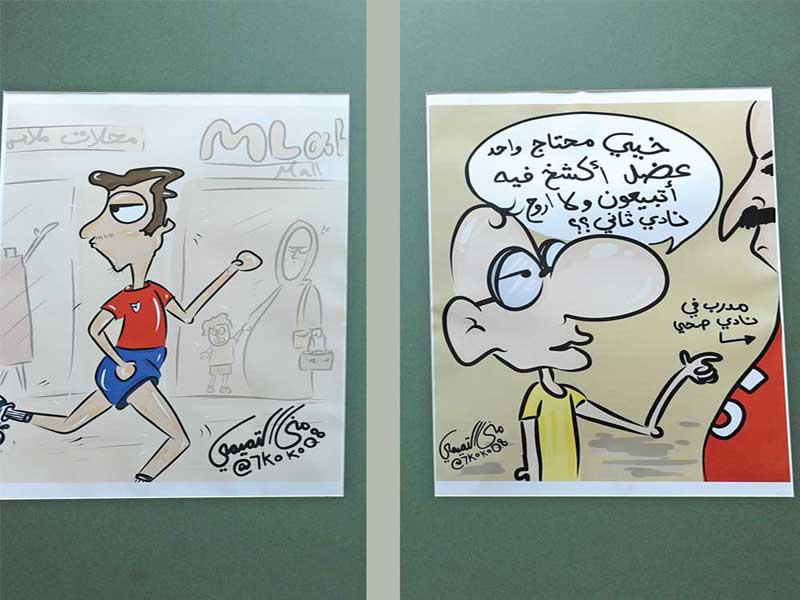 من جانبه، أعرب رئيس جمعية الكاريكاتير محمد ثلاب، في كلمة مماثلة، عن سعادته بالشراكة مع القطاع الرياضي ممثلا بالنادي العربي.وبيّن ثلاب ان دورهم كجمعية نفع عام يتمثل في مد يد التعاون مع القطاعين الحكومي والخاص وجمعيات النفع العام الأخرى، لتسليط الضوء على القضايا المهمة بما يخدم المجتمع، وذلك من خلال تقديم قوالب كاريكاتيرية ساخرة.وذكر أن الكاريكاتير الرياضي له دور كبير في الصحافة الرياضية من خلال النقد اللاذع للمشاكل الرياضية، لافتا الى أن له متابعين كثراً إلى جانب برامج وسائل التواصل الاجتماعي.وبين أن هذا المعرض الاستثنائي والختامي لأنشطة الجمعية عام 2019 يضم ٢٦ فنان كاريكاتير من أعضاء الجمعية من رواد الحركة الكاريكاتيرية وجيل الشباب الصاعد يعرضون أكثر من 70 لوحة تجمع بين الكارتون والكومبكس والبورتريه ويسلط الضوء على مواضيع رياضية.ولفت إلى أن المعرض يضم عدداً من اللوحات للاعبين محليين ودوليين مرسومة بالطريقة التقليدية، مبيناً أن الفنان القدير عبدالعزيز صادق من قطر هو ضيف شرف المعرض.من ناحيته، قال رئيس مجلس إدارة النادي العربي عبدالعزيز عاشور، في كلمة مماثلة، إن المعرض يهدف الى نشر ودعم أعمال الفنانين المميزين بنشاط الرسم الكاريكاتيري عن طريق الأندية الرياضية الكويتية.وأضاف عاشور ان النادي العربي من أوائل الأندية الرياضية التي تحتوي أعمال الفنانين المشاركين في هذا المعرص، مثمنا دور المجلس الوطني في دعم مثل هذه المعارض الهادفة.بدوره، أعرب ضيف شرف المعرض فنان الكاريكاتير القطري عبدالعزيز صادق في كلمته عن بالغ سعادته للمشاركة في المعرض، مثمنا دور النادي العربي على الاستضافة وتنظيم المعرض، ومبيناً أنها المرة الاولى التي يشارك بها في معرض بكاريكاتير رياضي.وأشاد صادق بحركة فن الكاريكاتير الكويتية التي يعود تاريخها لسنوات طويلة، لافتا إلى أنه من أشد المعجبين بتلك الحركة في الكويت لاسيما بعدما شهدت نشاطاً ملحوظاً على وسائل التواصل الاجتماعي التي ضمت مواهب كويتية وصلت إلى الاحترافية في هذا المجال.وقال إنه رغم قصر عمر جمعية الكاريكاتير الكويتية فإنها استطاعات أن تحقق إنجازات غيرت بصمة فن الكاريكاتير في الكويت.