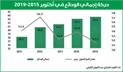 ارتفع إجمالي الودائع في أكتوبر 2019 وفق بيانات بنك الكويت المركزي على أساس سنوي بنسبة 1.2 في المئة، وبلغت أرصدة الودائع في البنوك المحلية نحو 43.6 مليار دينار، في الوقت الذي ارتفع النشاط الائتماني للبنوك بنسبة 4.7 في المئة على أساس سنوي، حين سجلت أرصدة التسهيلات الائتمانية بنهاية أكتوبر نحو 38.3 مليارا.ووفق تقرير صادر عن بيت التمويل الكويتي (بيتك)، بلغت قيمة النمو السنوي للودائع حوالي 535 مليون دينار، مدفوعا بارتفاع ودائع القطاع الحكومي بنسبة 9.9 في المئة (635 مليونا)، بينما تراجعت ودائع القطاع الخاص بنحو 0.3 في المئة (100.4 مليون).وعند المقارنة على أساس شهري، ارتفع إجمالي الودائع بنحو 0.5 في المئة، مدفوعا بارتفاع طفيف لودائع القطاع الخاص نسبته 0.3 في المئة، أي نحو 112 مليون دينار، بينما زادت الودائع الحكومية بنسبة 1.3 في المئة، أي 91 مليون دينار متخطية نحو 7 مليارات في أكتوبر 2019، مقارنة مع 6.9 مليارات في سبتمبر 2019. تراجعت حصة الودائع للقطاع الخاص الى 83.9 في المئة من إجمالي الودائع في أكتوبر 2019 مقارنة مع 84.7 بالمئة في أكتوبر 2018، بينما ارتفعت حصة ودائع القطاع الحكومي إلى 16.1 في المئة من إجمالي الودائع مقارنة مع 15.3 بالمئة في أكتوبر 2018، مدفوعة بارتفاع الودائع الحكومية في الوقت الذي سجل تراجعاً طفيفاً لودائع القطاع الخاص.