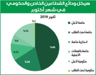 تراجعت ودائع القطاع الخاص تحت الطلب في أكتوبر على أساس شهري، أي بنسبة 2.3 في المئة، وودائع الادخار بنسبة 0.4 في المئة، في حين ارتفعت الودائع لأجل بنحو 1.2 في المئة على أساس شهري.وعلى ذلك ارتفعت ودائع القطاع الخاص بالعملة المحلية في أكتوبر على أساس شهري بنسبة 0.03 في المئة، أي حوالي 10.4 ملايين مقارنة مع 33.77 مليارا في سبتمبر 2019. على الجانب الآخر ارتفعت ودائع القطاع الخاص بالعملات الأجنبية بنسبة 3.7 في المئة زيادة عن حجمها بنهاية سبتمبر حين بلغت 2.7 مليار.إجمالي ودائع «الحكومي»