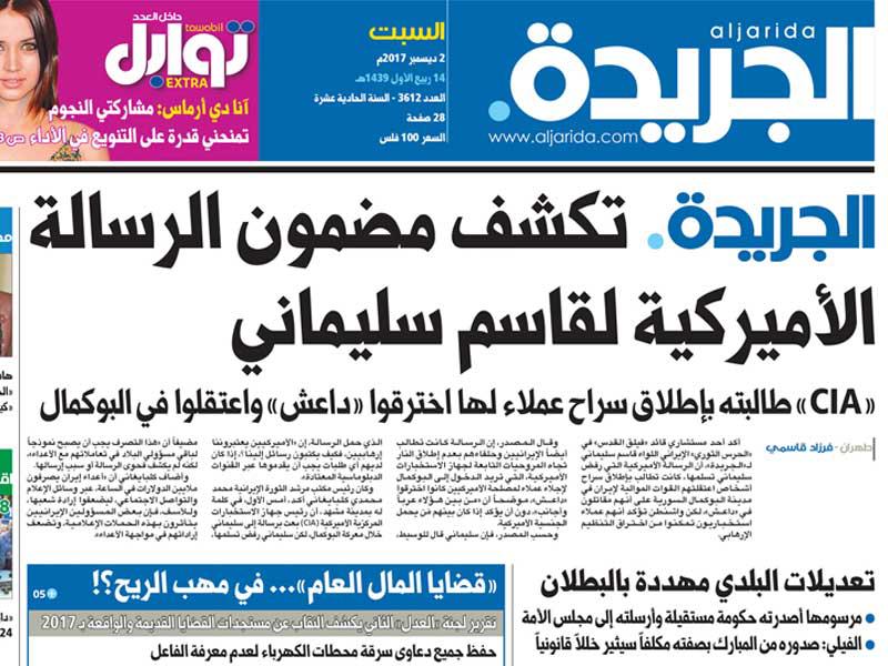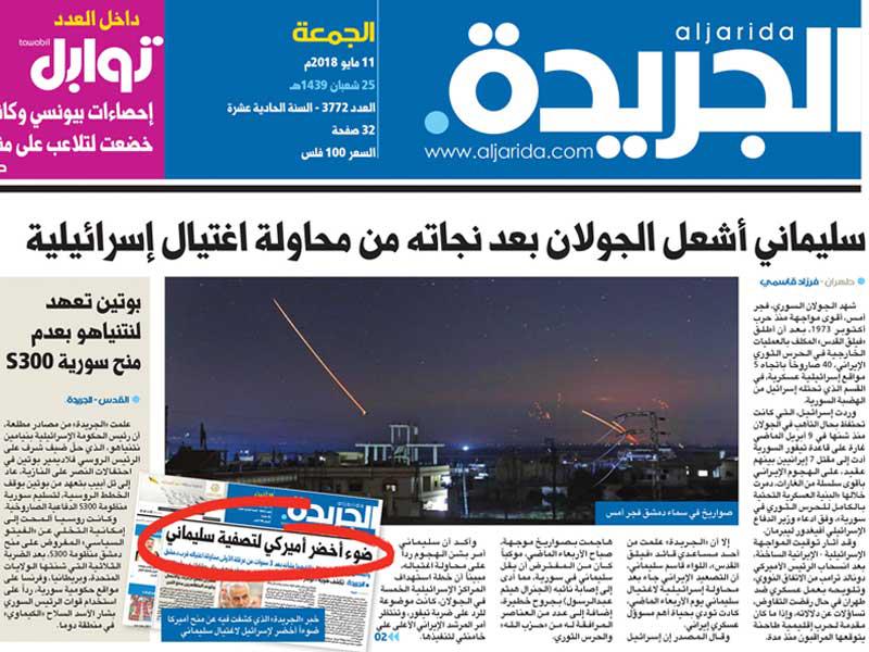 • في 1 يناير 2018 أثارت "الجريدة" ضجة على مستوى دولي، بعد نشرها خبراً عن ضوء أخضر أميركي لإسرائيل لاغتيال سليماني.• تقرير "الجريدة" الخاص من القدس كشف أن إدارة الرئيس الأميركي السابق باراك أوباما أحبطت محاولة اغتيال إسرائيلية لسليماني في دمشق.سجال بين «بيبي» وحجي قاسم