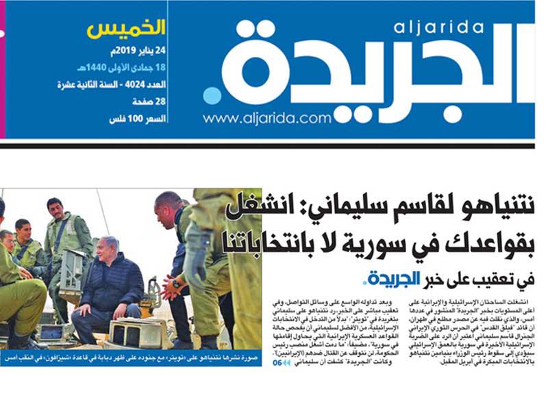 • في 24 يناير 2019، نشرت "الجريدة" تقريراً خاصاً من طهران كشفت فيه أن سليماني اقترح خلال اجتماع للقيادة الإيرانية شن "ضربات عميقة" داخل إسرائيل. • ولفت التقرير إلى أن مثل هذه الضربات قد تسقط رئيس الحكومة الإسرائيلي بنيامين نتنياهو (بيبي) في الانتخابات التي كانت مقررة في 9 أبريل. • بعد تداول خبر "الجريدة" على نطاق واسع رد نتنياهو على "حجي قاسم"، قائلا: "بدلا من التدخل في الانتخابات الإسرائيلية من الأفضل لك النظر إلى وضع قواعدك بسورية".محاولة اغتيال في الجولان
