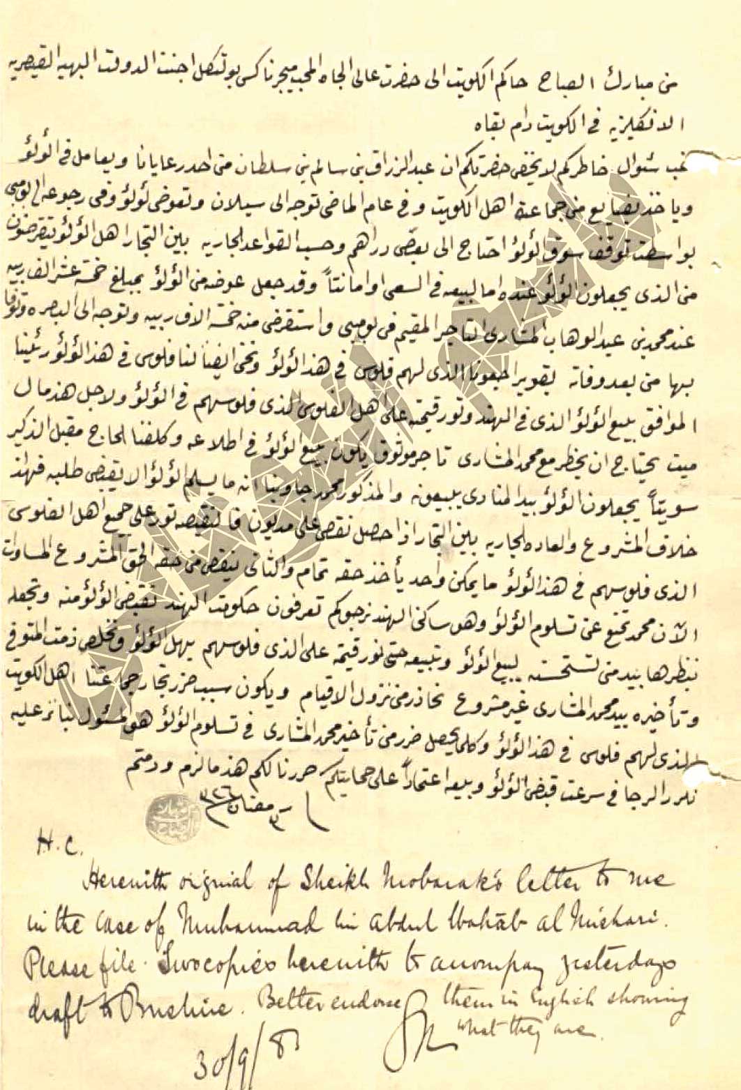 الشيخ مبارك يطلب من الإنكليز مصادرة اللؤلؤ من «المشاري» في بومبي عام 1908م