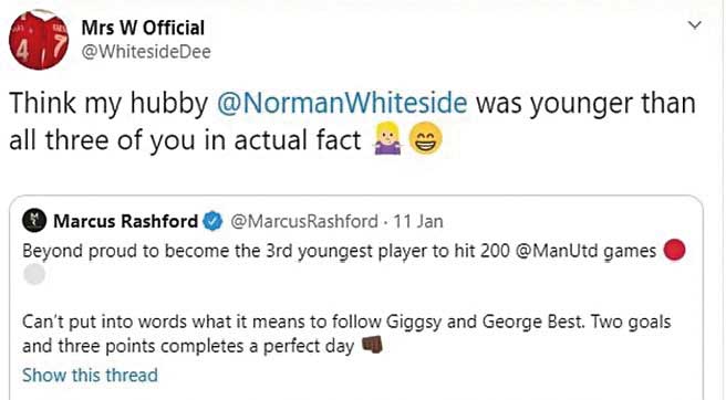 على الجانب الآخر، شارك راشفورد في مباراة نوريتش، وهي المباراة رقم 200 له مع النادي، بعمر 22 عاما، لكن الإحصائية التي وضعتها زوجة لاعب مانشستر يونايتد السابق، ربما تضع زوجها في مركز أعلى من جورج بيست وريان جيجز الذين يحتلان المركز الأول والثاني على الترتيب.وذكر راشفورد، عبر حسابه الرسمي على موقع «تويتر»، أنه فخور بالوصول إلى هذا الرقم القياسي مع مانشستر يونايتد، قبل أن ترد عليه زوجة وايتسايد، قائلة: «أعتقد أن نورمان وايتسايد كان أصغر من اللاعبين الثلاثة بشكل فعلي».وعقب ذلك قام راشفورد بعمل تغريدة أخرى عبر «تويتر» يشيد فيها بوايتسايد، وسط تجاهل من مانشستر يونايتد الذي اكتفى بتعديل الإحصائية المنشورة فقط.ويحتل مانشستر يونايتد المركز الخامس في ترتيب الدوري الإنكليزي برصيد 34 نقطة.