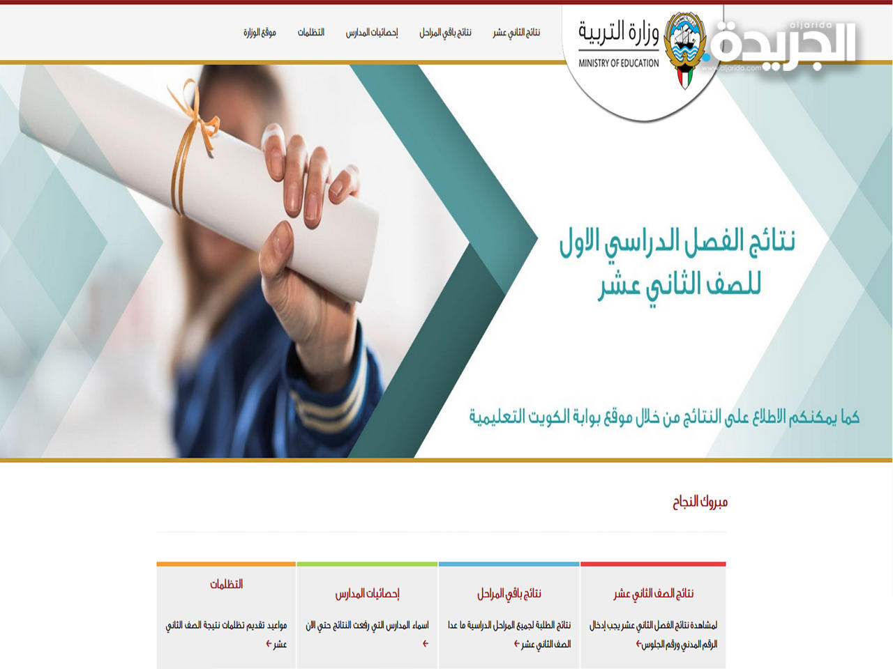 أعلنت وزارة التربية الكويتية اليوم الخميس رفع نتائج الفصل الدراسي الأول للصف ال12 بقسميه العلمي والأدبي والتعليم الديني على موقعها الالكتروني (http://moe.edu.kw).وذكرت الوزارة عبر حسابها الرسمي على موقع التواصل الاجتماعي (تويتر) ان النتائج سيتم اعلانها كذلك على بوابة الكويت التعليمية وعبر تطبيق الوزارة (moe).