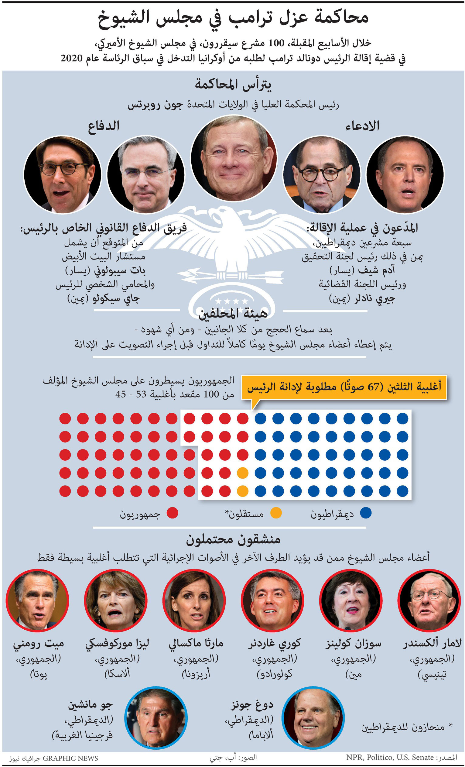 عقب تأدية أعضاء مجلس الشيوخ اليمين جماعياً أمام رئيس المحكمة العليا الأميركية جون روبرتس، الذي يترأس محاكمة عزل الرئيس دونالد ترامب، عيّن الأخير فريق دفاع قوياً لتمثيله، رغم أن احتمال عزله غير وارد بسبب سيطرة الجمهوريين على مجلس الشيوخ.