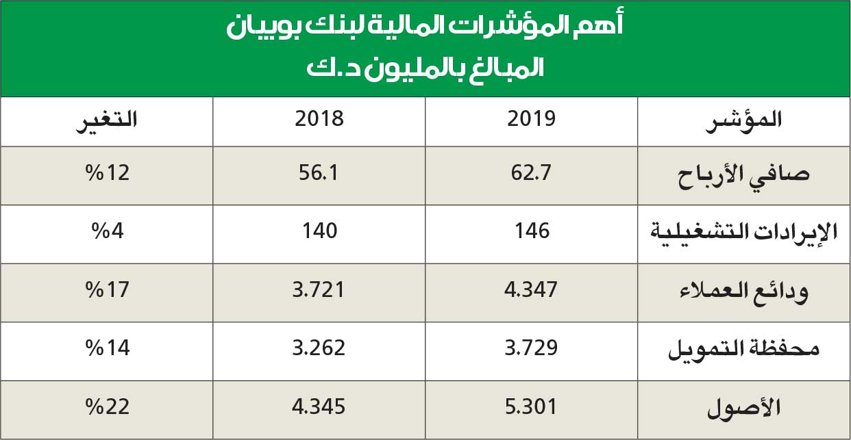 من جانبه، قال نائب رئيس مجلس الإدارة والرئيس التنفيذي للبنك عادل الماجد، «إنه على الرغم من التحديات التي تتعلق سواء بالمنافسة في السوق المحلي أو التحديات الإقليمية، فإننا نجحنا بفضل مواردنا البشرية في تحقيق اهدافنا في الاستحواذ على حصص سوقية في مختلف القطاعات، سواء في خدمات الافراد او الشركات». وأعرب الماجد عن فخره بالإنجازات التي تحققت على مدار السنوات الأخيرة، مشيراً الى «انه واكب العام الماضي احتفالنا بمرور 15 عاما منذ تأسس البنك، و10 سنوات منذ البدء في المرحلة الجديدة التي اثمرت العديد من الإنجازات والنجاحات التي تحققت، واهمها ارتفاع حصصنا بمختلف اشكالها في السوق»، مؤكدا أن المستقبل لايزال يحمل الكثير سواء للعملاء أو المساهمين.وأضاف ان «بوبيان مستمر في تنفيذ خططه التي تعتمد على التركيز في السوق المحلي مع البدء في توسعة الأنشطة الخارجية، التي بدأت مع اعلاننا في ديسمبر الماضي تقديم عرض للاستحواذ على بنك لندن والشرق الأوسط، وهي العملية التي لاتزال في مراحل التنفيذ حاليا». وأشار الماجد إلى أن جميع مؤشرات البنك الرئيسية شهدت نمواً ملحوظاً في عام 2019، حيث ارتفع إجمالي الأصول إلى 5.3 مليارات دينار بنسبة نمو قدرها 22 في المئة، كما ارتفعت ودائع العملاء إلى 4.3 مليارات بنمو نسبته 17 في المئة إلى جانب ارتفاع محفظة التمويل إلى 3.7 مليارات بنسبة نمو 14 في المئة إلى جانب الارتفاع المتواصل لقاعدة عملاء البنك.وأضاف أن إجمالي قيمة حقوق الملكية في البنك ارتفعت حتى نهاية 2019 الى 575 مليونا، كما ارتفعت الإيرادات التشغيلية لتصل إلى 146 مليونا. وقال الماجد إن الحصة السوقية من التمويل بصفة عامة ارتفعت إلى نحو 9.3 في المئة حالياً، بينما ارتفعت حصة البنك من تمويل الأفراد تحديدا إلى ما يقارب 12 في المئة الى جانب تحقيق معدلات نمو متميزة في المحفظة الائتمانية للشركات وصلت إلى 17 في المئة عن طريق جذب العديد من الشركات التشغيلية المعروفة بملاءتها المالية والاقتصادية، وذلك مع التمسك الشديد بأعلى معايير الجودة الائتمانية ودراسة وتنويع المخاطر.«بوبيان»... أسلوب حياة