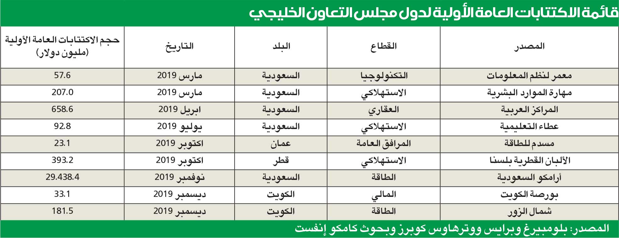 شكّل عام 2019 علامة بارزة لسوق الاكتتابات العامة الأولية في دول مجلس التعاون، وذلك على الرغم من انخفاض عدد الإصدارات على أساس سنوي مقارنة بمستويات عام 2018، حيث تراجع إجمالي عدد الاكتتابات العامة الأولية في المنطقة إلى 9 إصدارات في عام 2019 مقابل 17 إصداراً في عام 2018 و28 إصداراً في عام 2017. ووفق تقرير صادر عن شركة كامكو إنفست، جاءت إصدارات عام 2019 بصدارة الاكتتاب الذي طال انتظاره لطرح أسهم شركة أرامكو السعودية، والذي أعلن عنه في الربع الرابع من عام 2019. وتمكن الاكتتاب العام الأوّلي في أسهم "أرامكو" من تجميع 29.4 مليار دولار بعد طرح 1.7 في المئة من أسهم الشركة.وتمت تغطية الاكتتاب بنسبة 4.65 مرات من خلال إصدار 450 مليون سهم إضافي بعد أن مارست الشركة خيار التخصيص الإضافي للأسهم (greenshoe).
