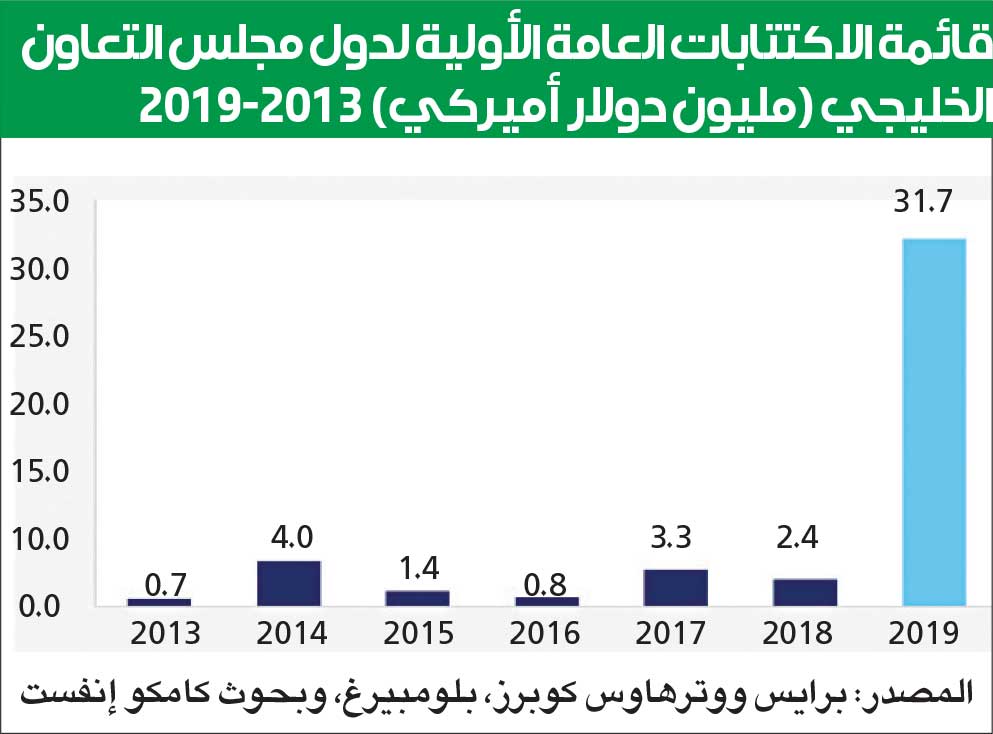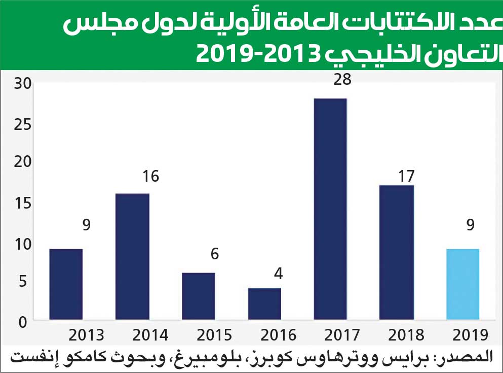 قفزت إصدارات رأس المال في دول مجلس التعاون الخليجي خلال عام 2019 عبر سوق الاكتتاب العامة الأولية بواقع 12.9 مرة على أساس سنوي، لتصل قيمتها إلى 31.1 مليار دولار. وكانت عمليات التخصيص والاكتتابات العامة الأولية للشركات الحكومية من أبرز الموضوعات على ساحة سوق الاكتتابات العامة الأولية في المنطقة.