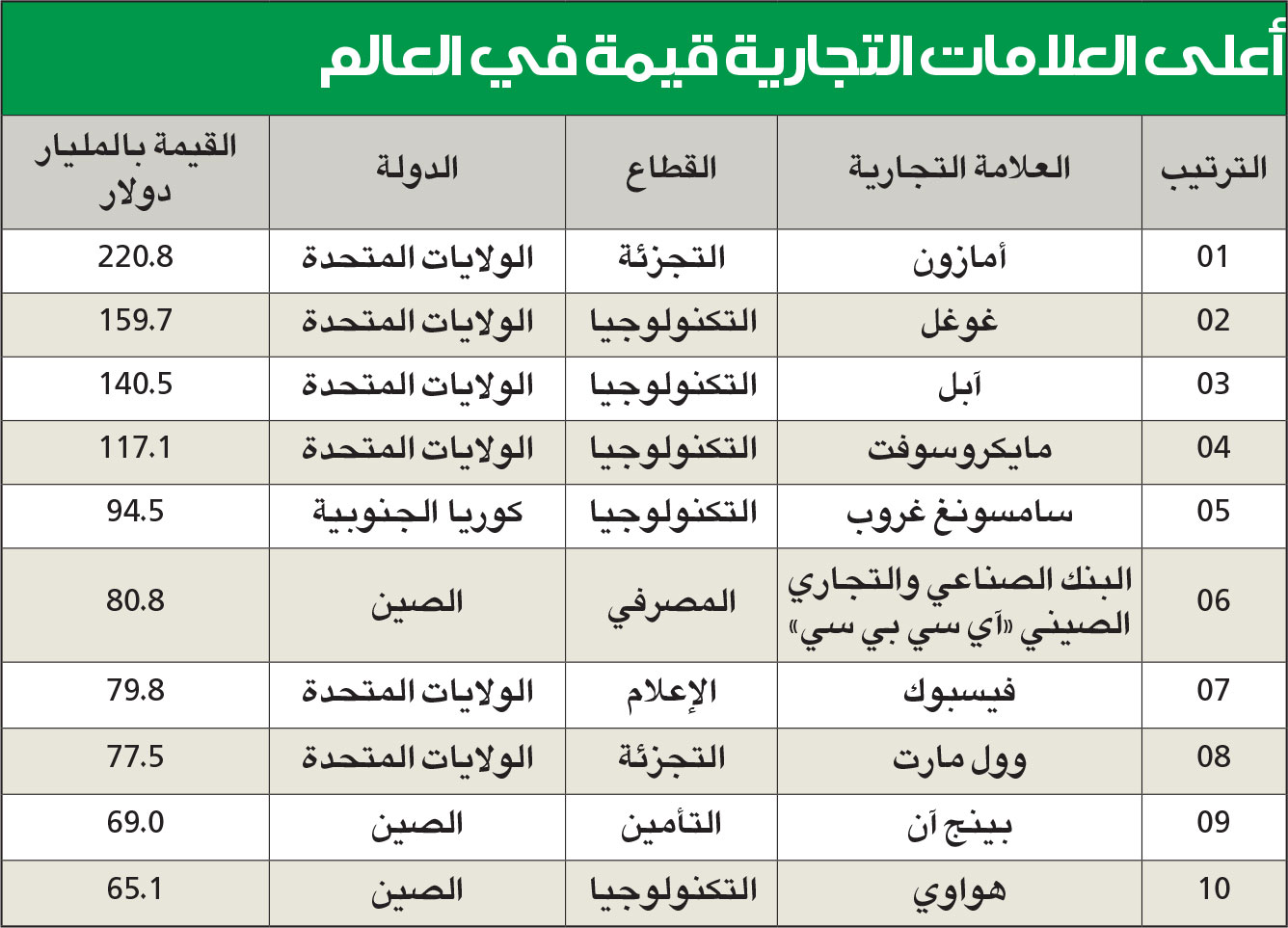 حافظت شركة التجارة الإلكترونية (أمازون) على مكانتها كأعلى العلامات التجارية قيمة في العالم للعام الثالث على التوالي، إذ أصبحت الأولى في التاريخ التي تتجاوز قيمة علامتها مستوى 200 مليار دولار، وفقاً للتصنيف السنوي «براند فاينانس غلوبال 500».وبلغت قيمة العلامة التجارية لشركة المليادرير «جيف بيزوس» 220.8 مليار دولار، أي أعلى من قيمة علامة «غوغل» – التي جاءت في المركز الثاني- بأكثر من 60 مليار دولار.وجاءت الألمانية «مرسيدس -بنز» كأعلى العلامات التجارية قيمة (65 مليار دولار) في صناعة السيارات، لكنها في الترتيب الحادي عشر بين الشركات من كافة الصناعات، وبعدها «تويوتا» في المركز الخامس عشر.وعلى الرغم من انخفاض أسعار النفط والغاز، فإن الشركة الأنجلو –هولندية «شل» حافظت على مركزها كأعلى الشركات قيمة في صناعة النفط، إذ بلغت قيمة علامتها التجارية 47.5 مليار دولار، لتحصد المركز الثالث والعشرين بين شركات العالم.