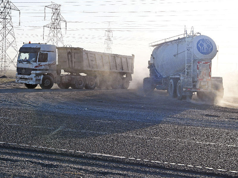 حياة العابرين تحت رحمة الآليات الثقيلة على طريق كبد(تصوير عبدالله الخلف)