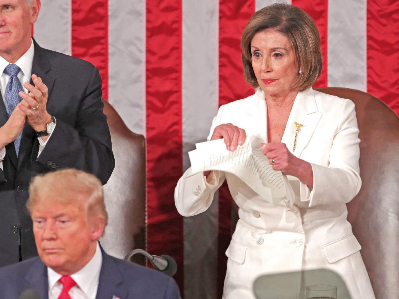 بينما كان الرئيس الأميركي يلقي خطابه عن حال الاتحاد، كان نصف الحاضرين يهتفون تأييداً له فيما كان يجلس النصف الثاني في تجهم وصمت تخللته أحياناً صيحات الاستهجان والهمسات المتقطعة، إلى أن قامت زعيمتهم نانسي بيلوسي في النهاية بتمزيق نص خطاب الرئيس.