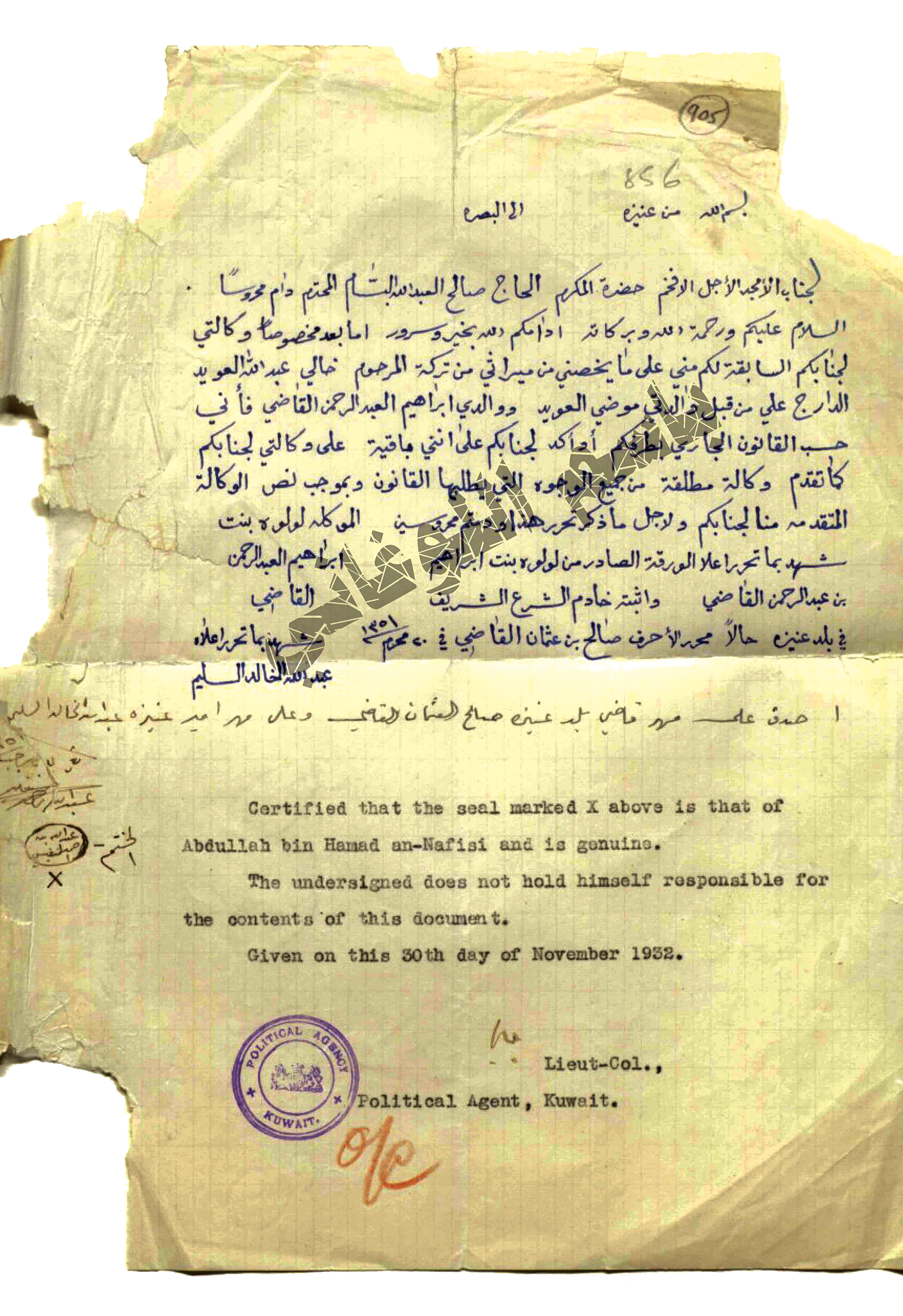 تبدأ الوثيقة التي حررها صالح بن عثمان القاضي بما يلي:"بسم اللهمن عنيزة إلى البصرةلجناب الأمجد الأجل الأفخم المكرم الحاج صالح العبدالله البسام المحترم دام محروساً السلام عليكم ورحمة الله وبركاتهأدامكم الله بخير وسرور، أما بعد مخصوصا، وكالتي لجنابكم السابقة لكم مني على ما يخصني من ميراثي من تركة المرحوم خالي عبدالله العويد الدارج علي من قبل والدتي موضي العويد، ووالدي إبراهيم العبدالرحمن القاضي، فإني حسب القانون الجاري بطرفكم، أؤكد لجنابكم على أنني باقية على وكالتي لجنابكم كما تقدم وكالة مطلقة من جميع الوجوه التي يطلبها القانون، وبموجب نص الوكالة المتقدمة منا لجنابكم، ولأجل ما ذكر تحرر هذا ودمتم محروسين.الموكلة لولوة بنت إبراهيم العبدالرحمن القاضي.شهد بما تحرر أعلى الورقة الصادر من لولوة بنت إبراهيم بن عبدالرحمن القاضي، وأثبته خادم الشرع الشريف في بلد عنيزة حالاً محرر الأحرف صالح بن عثمان القاضي في 20 محرم 1351 هـ. شهد بما تحرر أعلاه عبدالله الخالد السليم".وهنا يتضح لنا أن الورقة كتبها قاضي مدينة عنيزة صالح بن عثمان القاضي، وشهد عليها أمير مدينة عنيزة عبدالله الخالد السليم، وبخط آخر ولون آخر نشاهد تصديق الوكيل السعودي المعتمد في الكويت عبدالله النفيسي. كما نشاهد أيضاً تصديق المعتمد البريطاني في الكويت على الورقة باللغة الإنكليزية، وهو تصديق على صحة التوقيعات الواردة في الورقة، وليس على ما ورد فيها من مضمون.نتوقف عند هذا الحد، ولنا لقاء آخر ووثيقة أخرى، إن شاء الله في الجمعة المقبلة.