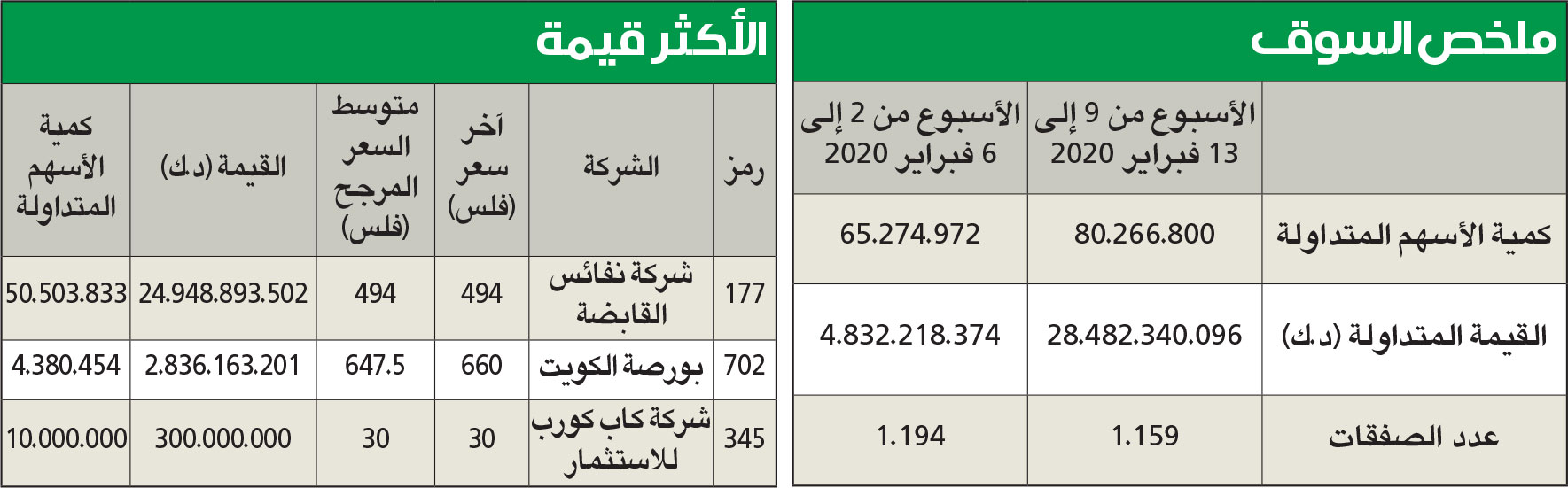 وشهدت منصة «OTC» خلال الأسبوع الماضي انخفاضاً في قيمة وكمية الأسهم المتداولة لسهم شركة بورصة الكويت مقارنة مع الأسبوع الذي سبقه، إذ بلغت كمية الأسهم المتداولة للشركة حتى انتهاء جلسات الخميس 13 فبراير 2020 عدد 4.38 ملايين سهم بقيمة 2.83 مليون دينار تمت عبر 1.107 صفقة، وبلغ الحد الأعلى لسعر سهم شركة البورصة خلال الأسبوع الماضي 700 فلس والحد الأدنى للسعر 541 فلساً، ومتوسط السعر 647.5 فلساً.ومن حيث الأسهم الأكثر قيمة خلال هذا الأسبوع، تصدر سهم شركة نفائس القابضة الأسهم بتداولات بلغت قيمتها 24.94 مليون دينار، تلاه سهم شركة بورصة الكويت بتداولات بقيمة 2.83 مليون دينار وفي المركز الثالث سهم شركة «كاب كورب» للاستثمار بإجمالي قيمة تداولات بلغت 300 ألف دينار.