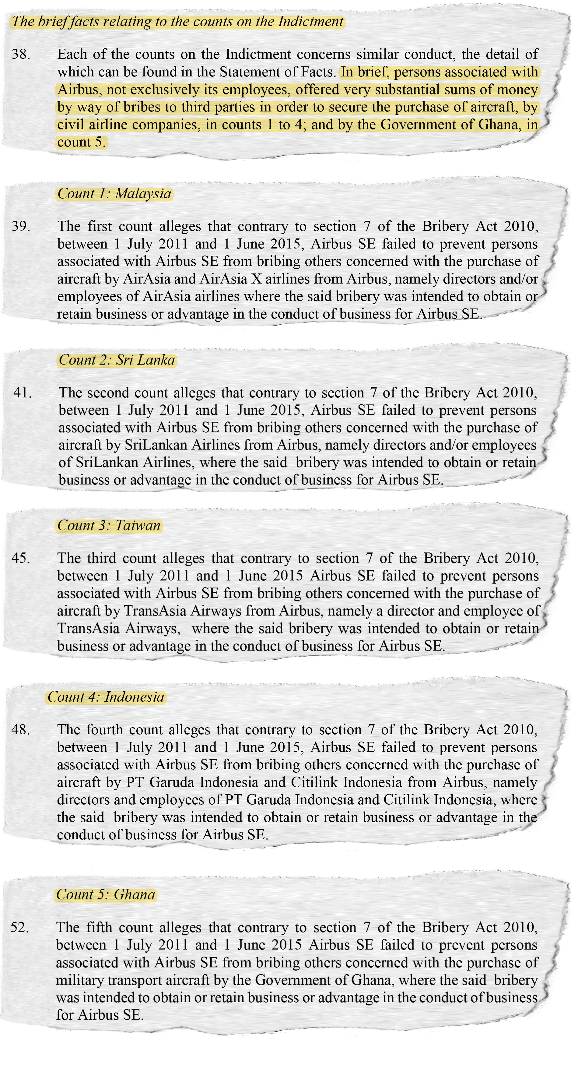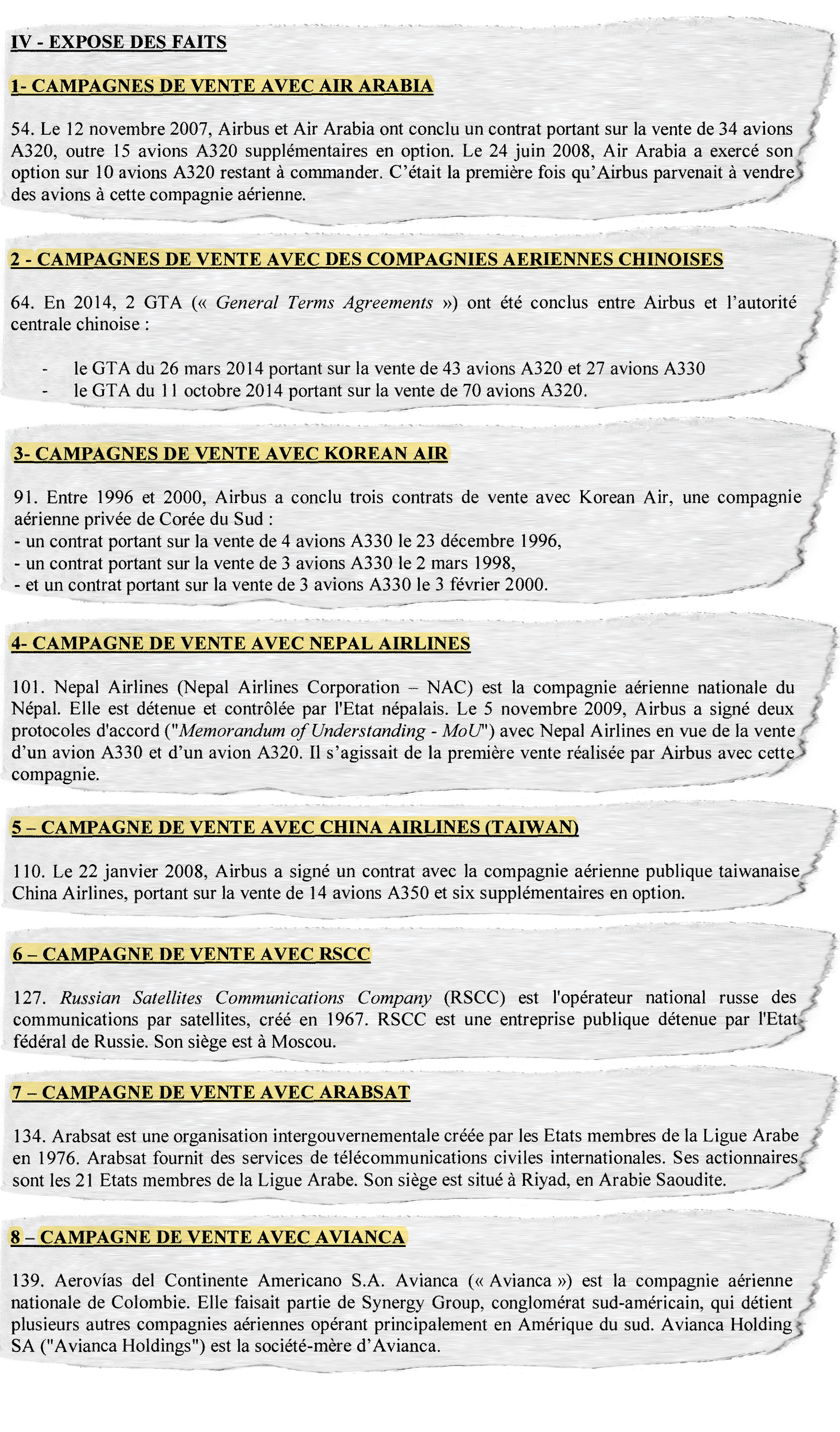 هذه كانت الإشارة الوحيدة التي ورد فيها اسم دولة الكويت في القرار البريطاني، الذي جاء في 32 صفحة، ونشر على الموقع الإلكتروني للمحاكم القضائية البريطانية، ولم تحمل الإشارة أي اتهامات مؤكدة عن عمليات «إيرباص» في الكويت، بل إن القرار البريطاني، حين عرض أدلة الفساد والاتهامات، اقتصر على عمليات «إيرباص» في خمس دول فقط، هي: ماليزيا، وسريلانكا، وتايوان، وإندونيسيا، وغانا، بحسب ما انتهى إليه تحقيق مكتب تحقيقات الفساد البريطاني، ولم تكن الكويت من ضمنها.وأشار القرار البريطاني إلى أنه تمت التسوية بين «إيرباص»، والدول الثلاث بتغريم الشركة 306 مليارات يورو، بناء على الانتهاكات الواردة في حيثيات الحكم بشأن مخالفات الشركة التي أثبتتها جهات التحقيق في تلك الدول، كما أشار الحكم إلى أن مكتب تحقيقات الفساد البريطاني أبلغ المحكمة أنه لا ينوي إعادة فتح التحقيق في عمليات «إيرباص» أو شركاتها التابعة.وفي التسوية بين «إيرباص» وهيئة الادعاء الفرنسي، والتي أشار إليها قرار المحكمة البريطانية كذلك، ورد اسم الكويت، مرة واحدة أيضاً، وذلك لدى استعراض المناطق التي أجرى بها تحقيقاته في عمليات الشركة، وهي نفس الدول التي ذكرت في الحكم البريطاني؛ الإمارات، والصين، وكوريا الجنوبية، والنيبال، والهند، وتايوان، وروسيا، والسعودية، وفيتنام، واليابان، وتركيا، والمكسيك، وتايلند، والبرازيل وأخيراً الكويت.وذكرت اتفاقية التسوية، التي جاءت في 22 صفحة، واستعرضت تفاصيل التدقيق والتفتيش، أن حالات فساد «إيرباص» تمثلت في ٨ شركات، هي: طيران العربية، والخطوط الصينية، وطيران كوريا، والخطوط النيبالية، وخطوط تايلند، إلى جانب الشركة الروسية للاتصالات عبر الأقمار الصناعية، وشركة عربسات و«طيران كولومبيا»، دون توجيه أي اتهام أو إشارة إلى وجود فساد في عمليات الشركة بالكويت. وانتهت الاتفاقية، التي وقعها الادعاء الفرنسي و«إيرباص» في 29 يناير الماضي، إلى دفع الشركة مبلغ ٢ مليار يورور تقريباً. أما في الولايات المتحدة ، فكان لتلك القضية جانب آخر ، إذ شهد اتفاق التسوية بين الولايات المتحدة و«إيرباص»، والذي صادقت عليه محكمة كولومبيا الأميركية، وجاء قرارها في 104 صفحات، استعراض جميع المخالفات التي رصدها التحقيق الأميركي، وذكر فيه اسم دولة الكويت في حادثتين. وجاء في البند 180 من هذا الاتفاق ، أن «إيرباص» استخدمت مستشاراً لبنانياً، لديه العديد من الأعمال التجارية في بلاده، كشريك أعمال (وسيط) بين عامي 1996 و2016، حيث استعانت به الشركة من خلال قطاع مبيعات الطائرات التجارية والهليوكوبتر، بسبب علاقاته مع أعضاء حاليين وسابقين في الحكومة الكويتية.وأشارت التسوية إلى أن مسؤول «إيرباص» دفع للوسيط اللبناني 860 ألف يورو في صفقة طائرات الهليوكوبتر مع الكويت، وتم إيداع المبلغ في أحد البنوك اللبنانية، كما قامت الشركة بالاستثمار في إحدى الشركات المملوكة لهذا الوسيط.واعتبرت أن استعانة «إيرباص» بهذا الوسيط اللبناني مخالف للوائح الاتجار الدولي للأسلحة الأميركية، التي تمنع التعاملات العسكرية مع دولة لبنان ومواطنيها، وهو نظام تنظيمي لمراقبة تصدير التكنولوجيا الدفاعية والعسكرية لا يَسمح بمشاركة معلومات عسكرية، إلا مع شخصيات أميركية، ما لم يتم الحصول على إذن أو إعفاء خاص من «الخارجية» الأميركية، وهو ما لم يملكه الوسيط اللبناني، أو تفصح عنه «إيرباص» بوصفها شركة مسجلة في الولايات المتحدة.وتكررت الحادثة السابقة مع وسيط أعمال آخر فرنسي الجنسية، إلا أن شركته مقيدة في لبنان، واستخدم حسابه البنكي اللبناني لإجراء عملياته مع «إيرباص» لعدة دول، منها الكويت وكرواتيا وتركمانستان وجمهورية الشيك، وتحصل على 1.4 مليون يورو، وهو ما شكل مخالفة لعدم إفصاح الشركة عن استخدامها وسيطاً أجنبياً في بيع معدات عسكرية، كما أن الوسيط الفرنسي لم يكن مقيداً في السجلات الأميركية، ولم يحصل على إعفاء من «الخارجية».