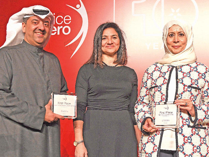 رئيس مؤسسة "سيرڤس هيرو" فاتن أبوغزالة تتوسط الرئيسة التنفيذية لـ "زين الكويت" إيمان الروضان والخشتي مع جوائز «زين» كأفضل مُشغّل اتصالات ومُزوّد خدمات إنترنت