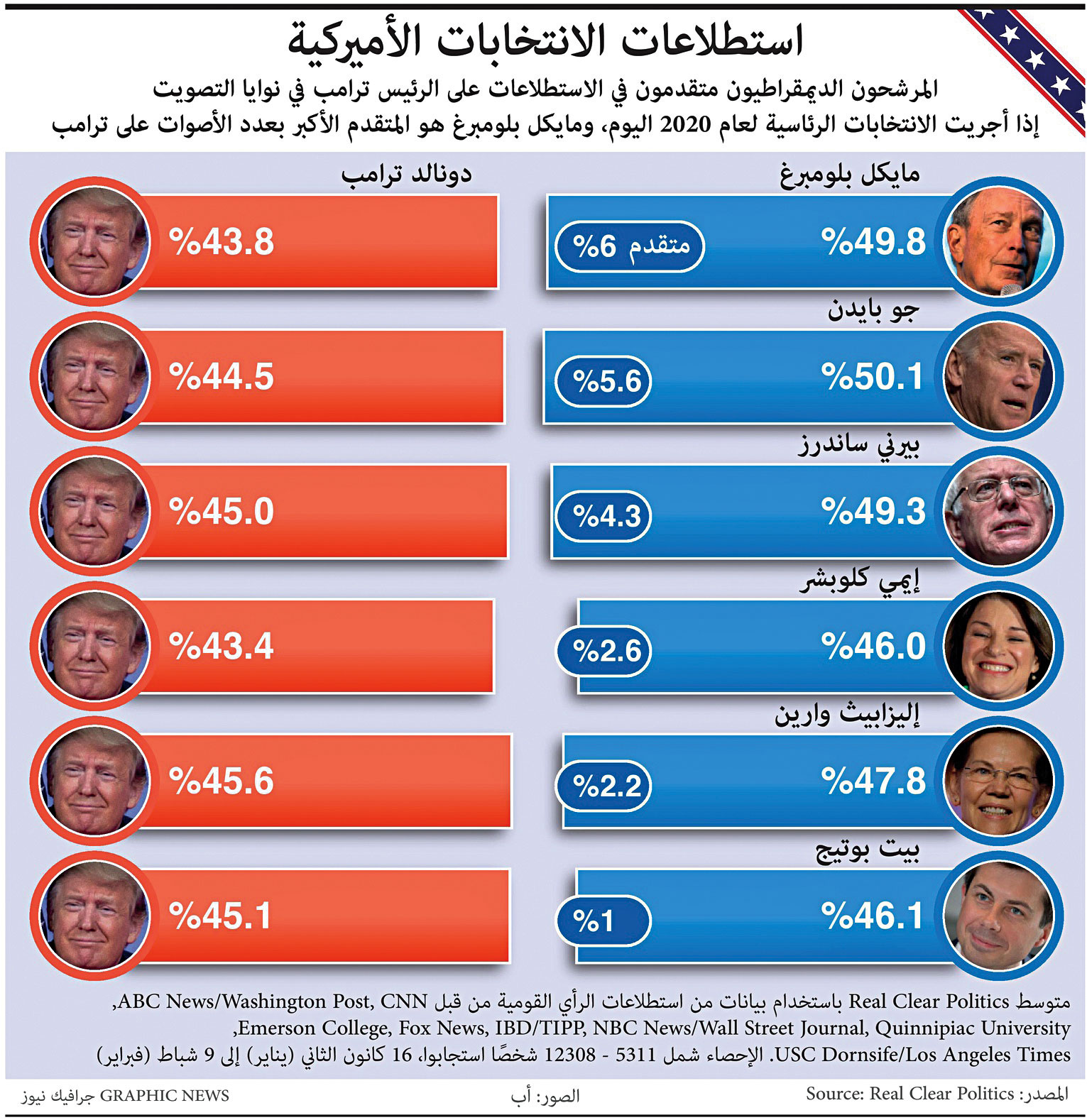 قررت حملة الرئيس الجمهوري دونالد ترامب مواجهة عمدة نيويورك السابق الملياردير مايكل بلومبرغ، منافسه الديمقراطي المحتمل في الانتخابات الرئاسية المقرّرة في نوفمبر المقبل، والذي ينفق مئات الملايين من ثروته الخاصة، بشكل كبير على الإعلانات، بمواجهته بمليار دولار، في حين يواصل السيناتور الاشتراكي بيرني ساندرز تفوّقه على الصعيد الوطني في مجمل استطلاعات الرأي.